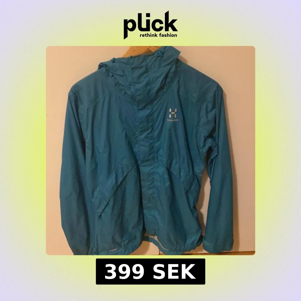 Säljer en blå vindjacka från Haglöfs med huva och dragkedja. Perfekt för blåsiga dagar och utomhusaktiviteter. Jackan har långa ärmar och en enkel design.