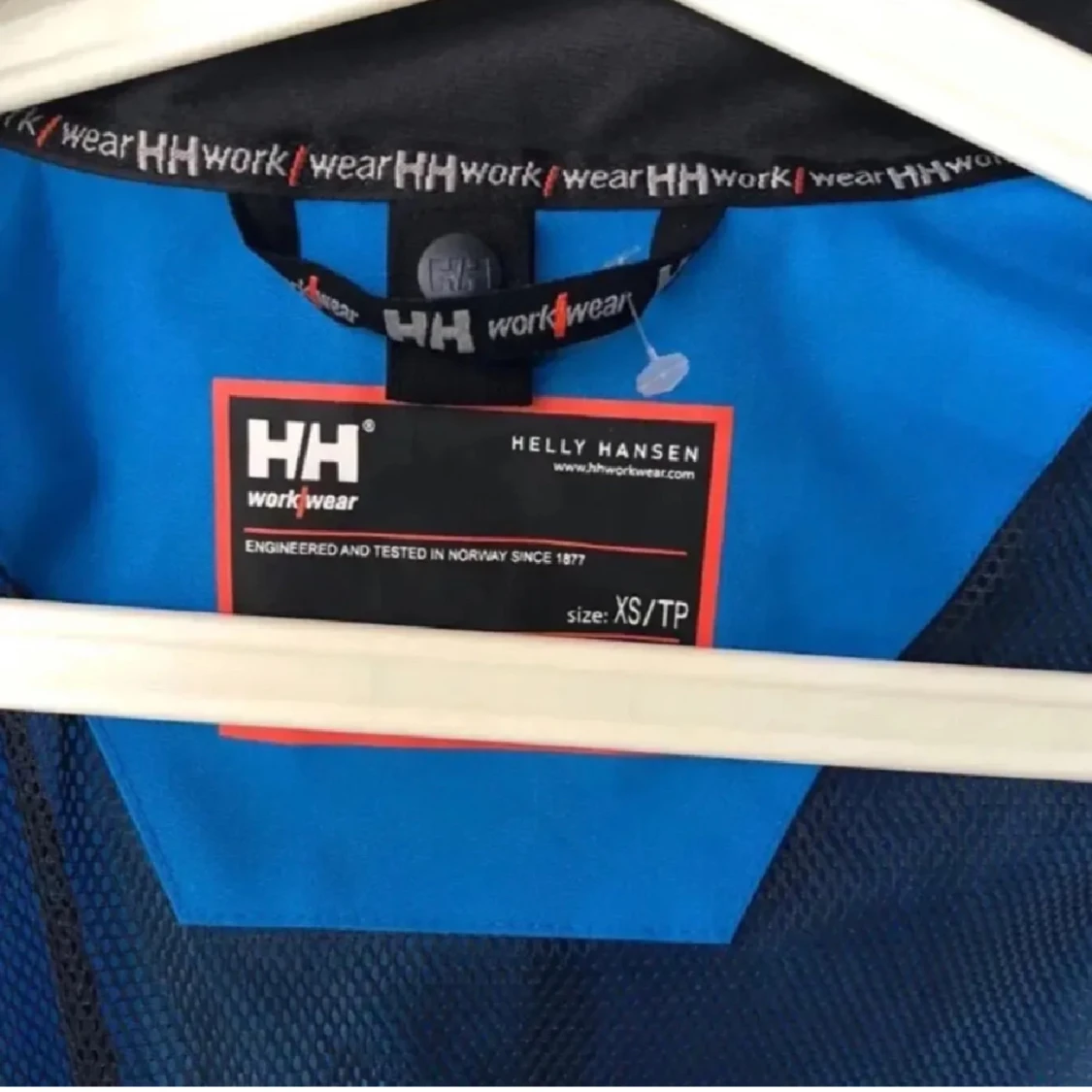 Säljer en snygg blå vindjacka från Helly Hansen. Jackan har en dragkedja framtill och flera praktiska fickor med dragkedjor. Perfekt för blåsiga dagar och outdoor-äventyr. Den är i storlek XS och passar bra för dig som gillar en tight passform.