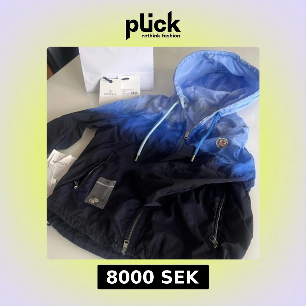 Säljer en snygg blå vindjacka från Moncler med huva och dragkedja. Jackan har en gradient från ljusblått upptill till mörkblått nedtill, två fickor med dragkedja och justerbara snören i huvan. Kom med ett pris denna Moncler säljs inte längre, Lämnar in den i Kemi tvätt innan den köps så den blir helt ren.