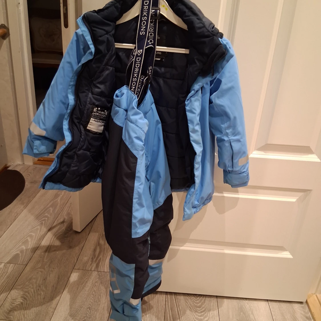 Säljer en blå och mörkblå vinterjacka från Didriksons med matchande byxor. Jackan har långa ärmar, reflexdetaljer och är vadderad för extra värme. Perfekt för kalla dagar och snölek. Klassisk design med dragkedja och justerbara ärmslut.
