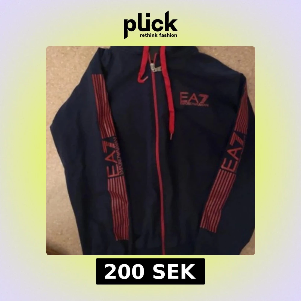 Säljer en blå ziphoodie från Emporio Armani EA7 med röda detaljer och dragkedja. Hoodien har röda snören och tryckta EA7-loggor på bröstet och ärmarna. Perfekt för en sportig och stilren look.