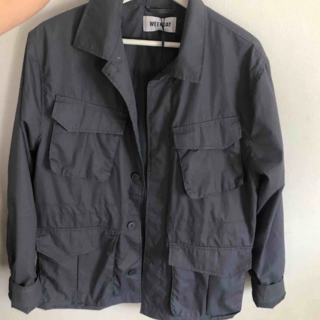 Svinsnygg vårjacka som tyvärr är för liten. Jättebra skick! Blågrå färg och som går att spänna i svanken. Passar XS-liten M beroende på hur den ska sitta🌼