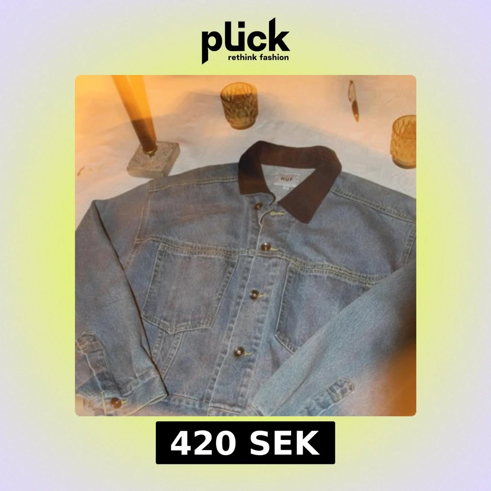 Säljer en blå jeansjacka från HUF med mörk krage och stora bröstfickor. På ryggen finns ett stort broderi med dödskalle i blå kåpa omgiven av röda rosor och texten 'HUF Worldwide'.