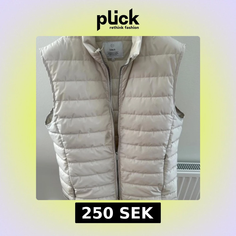 Snygg krämvit dunväst från Bläck i storlek M. Västen har horisontella quiltade sömmar och en praktisk dragkedja framtill. Perfekt att slänga över en hoodie eller tröja när det är kyligt ute. Stilren och enkel design som funkar till många outfits. Har en liten fläck på framsidan men går nog bort i tvätt