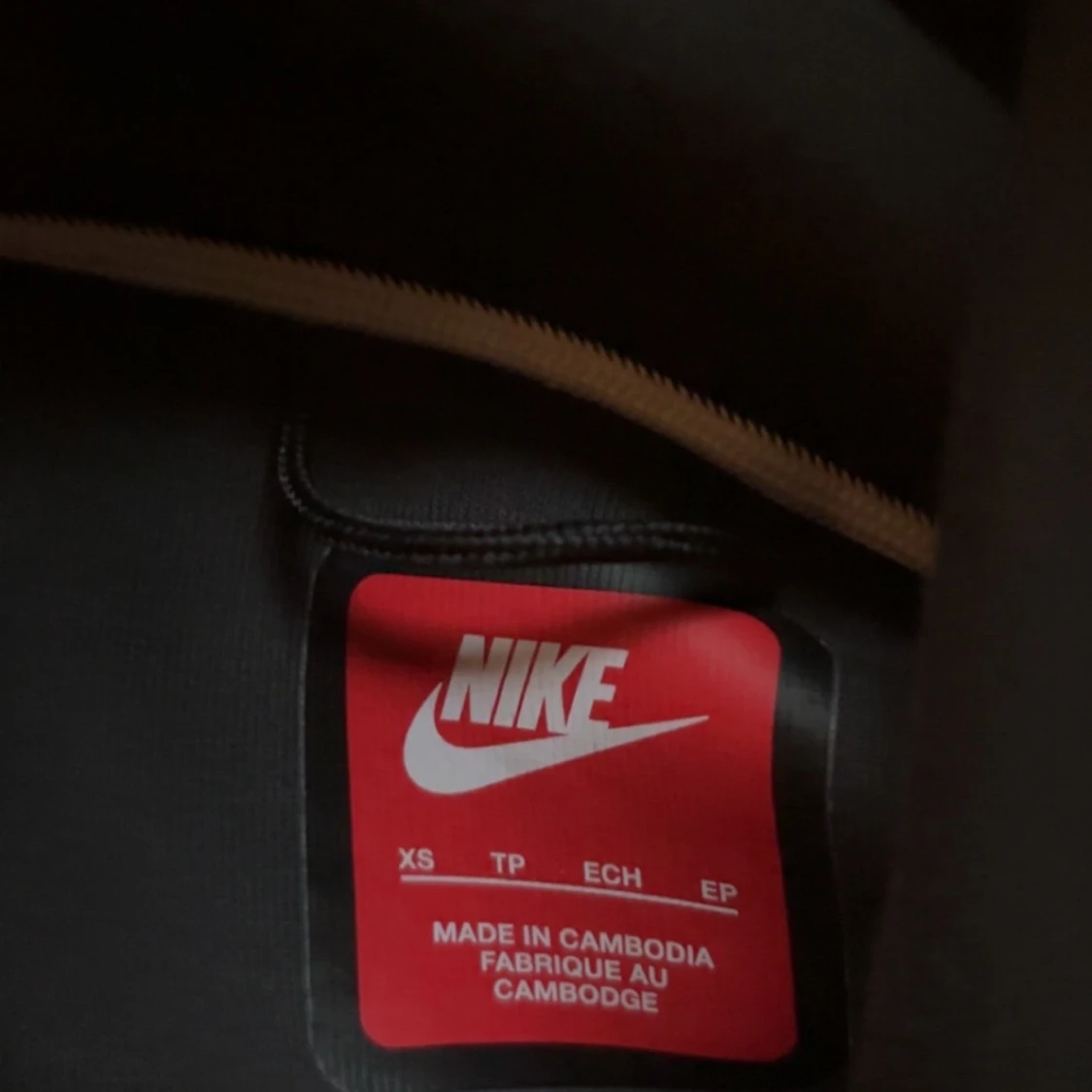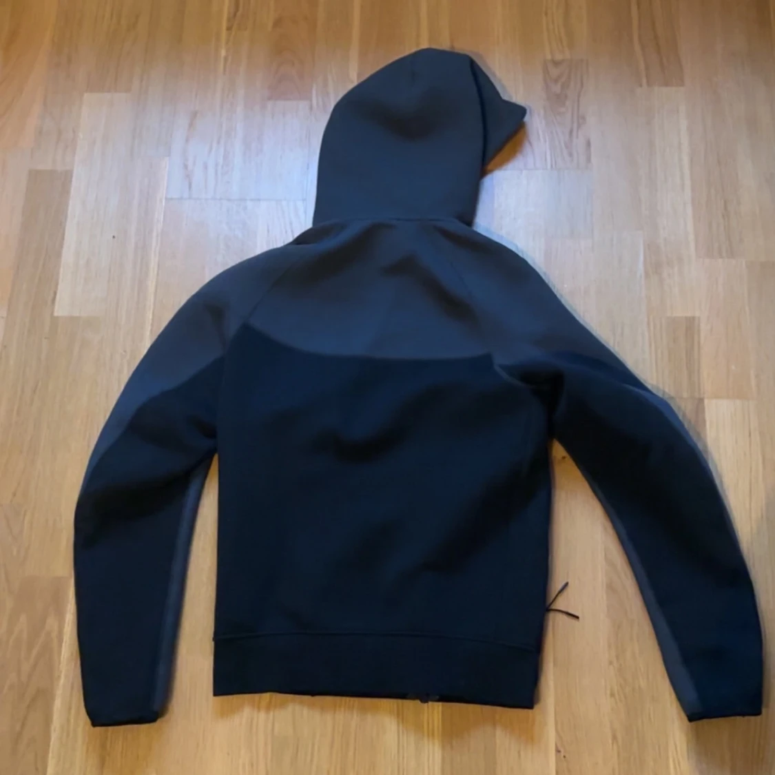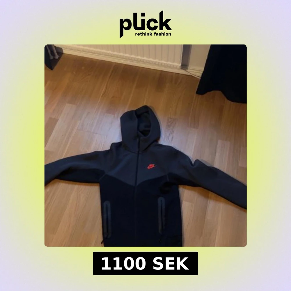 Säljer en svart hoodie från Nike med röd logga på bröstet. Den har en dragkedja framtill och två fickor med dragkedjor. Perfekt för en sportig look eller avslappnade dagar.