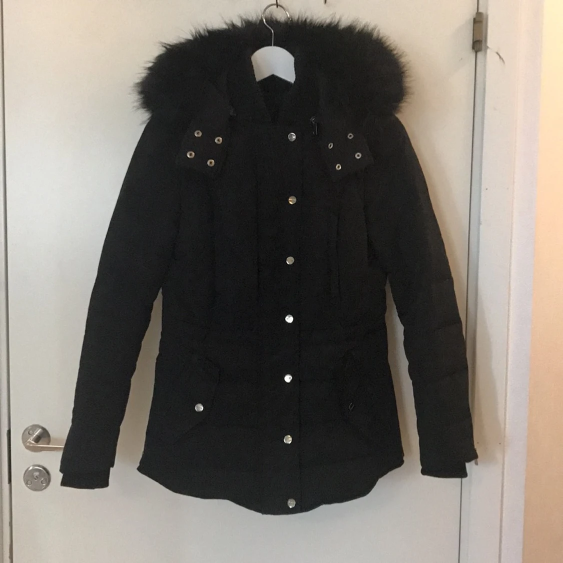 Svart jacka från Zara. Gulddetaljer och med svart päls. Något figursydd runt midjan.