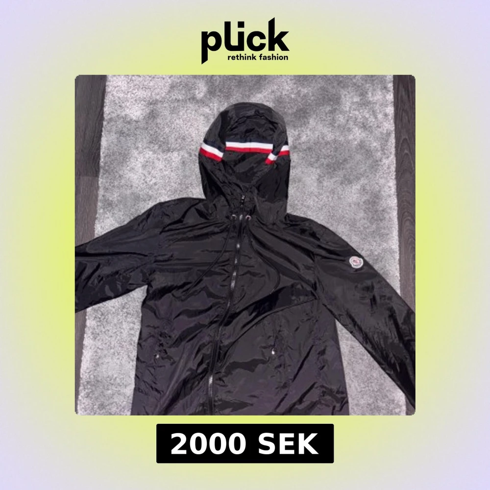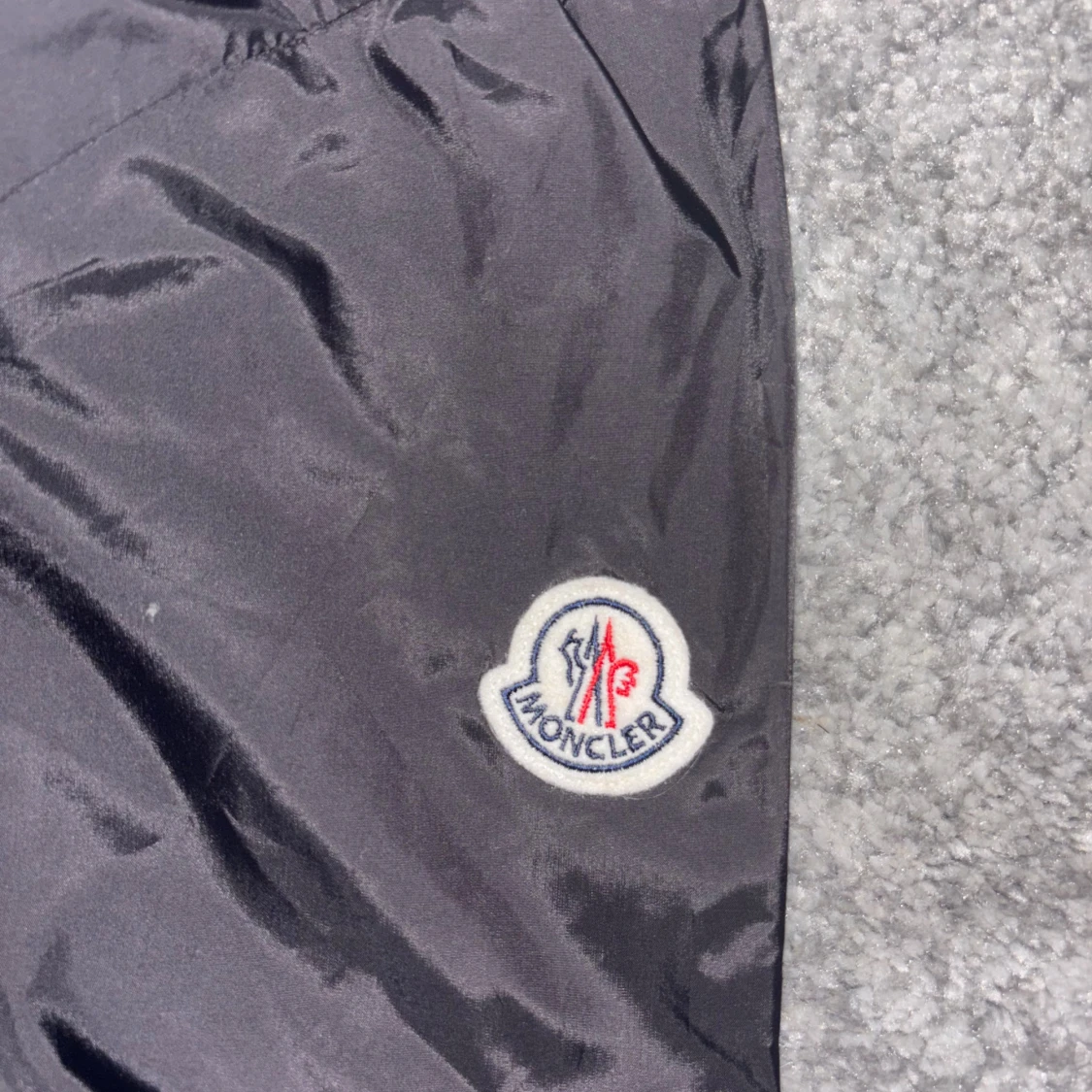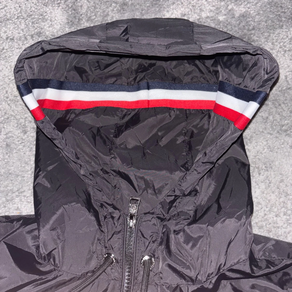 Svart vindjacka från Moncler med huva och dragkedja framtill. Jackan har Moncler-logga på ärmen och snygga röd, vit och blå detaljer på huvkanten. Tillverkad i glansig polyester och har snörning vid huvan samt fickor med dragkedja.