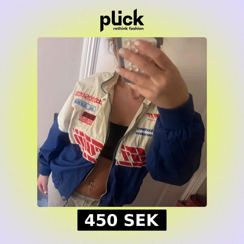 Snygg blå och vit vindjacka från Pull&Bear med racing-inspirerade tryck och broderier i rött och blått. Jackan har dragkedja, ståkrage och muddar vid ärmslut och midja. Perfekt för dig som gillar sportig och retro stil! :) ⚠️ORIGINAL PRIS: 800kr ⚠️