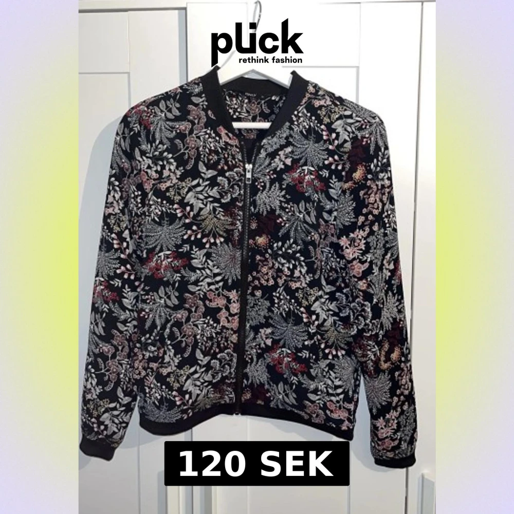 Säljer en svart bomberjacka från ONLY med blommigt mönster i vitt, rosa, rött och beige. Jackan har dragkedja framtill, ribbade muddar och lång ärm. Perfekt för dig som vill ha en cool och unik look med mycket detaljer.