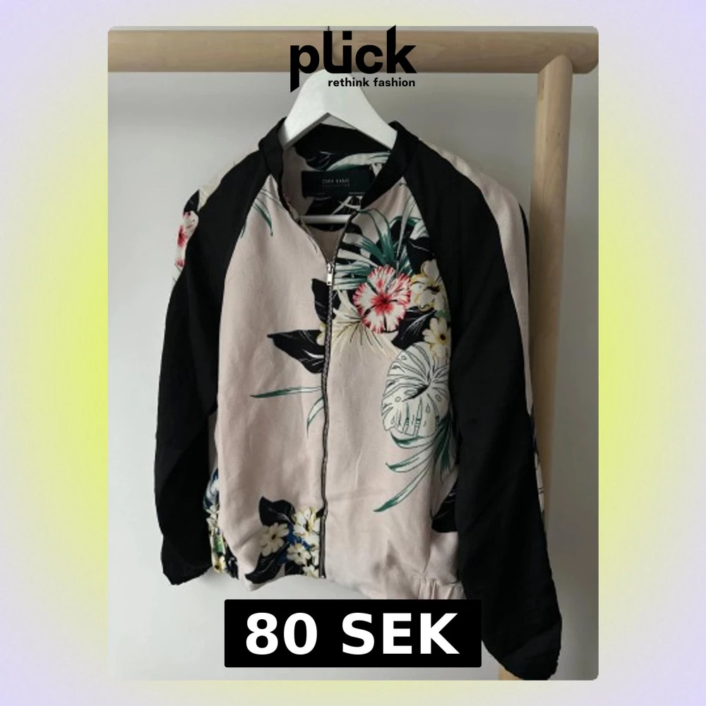 Säljer en snygg bomberjacka från Zara Basic med blommigt mönster i svart, beige, grönt och inslag av rött och blått. Jackan har svarta ärmar, dragkedja framtill och elastisk midja.