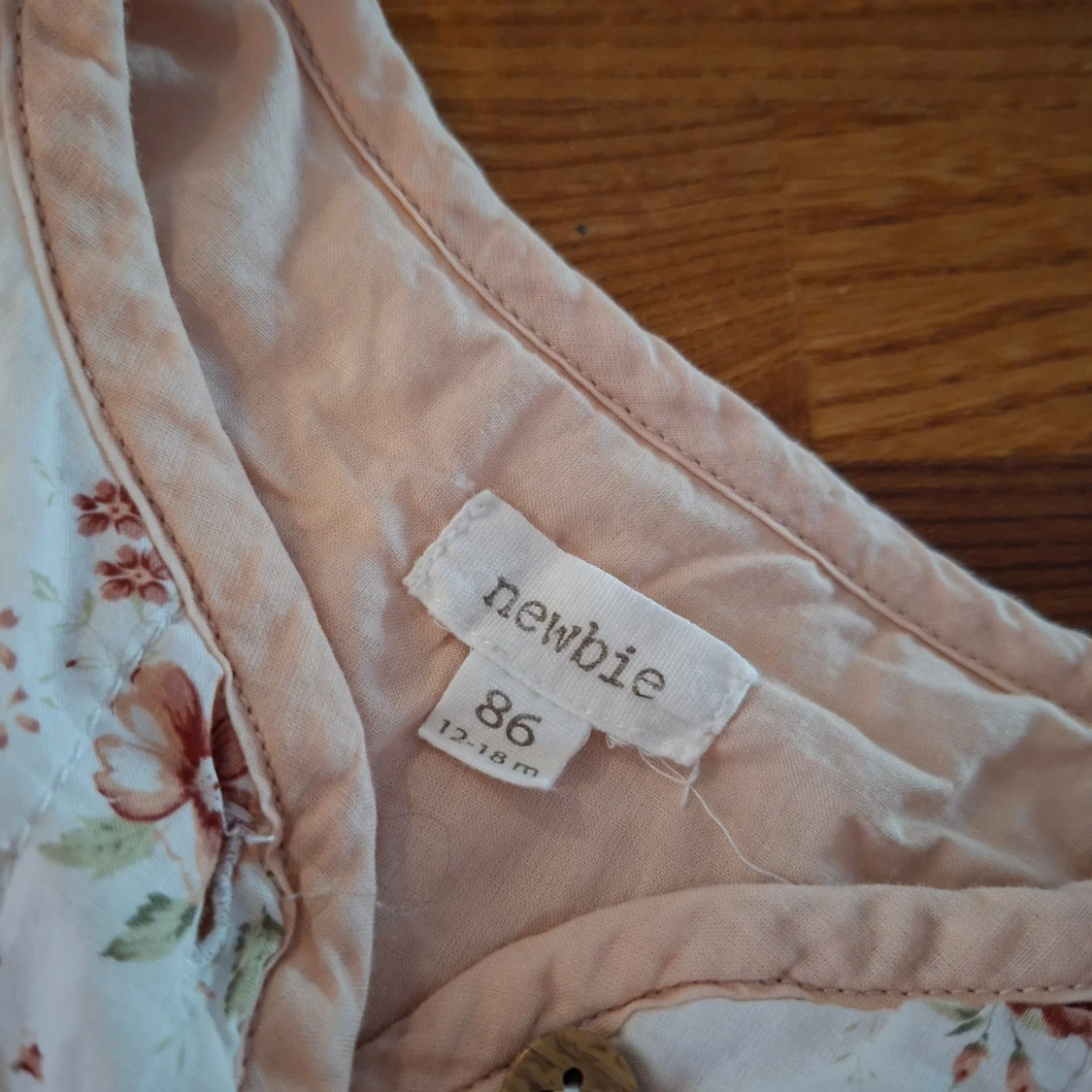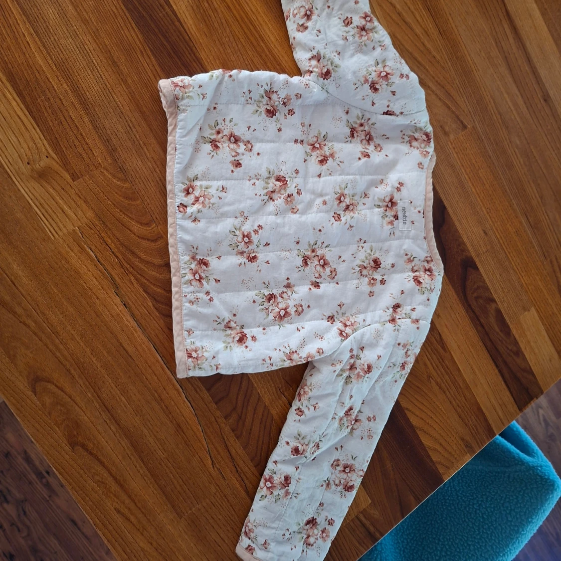 Supersöt quiltad jacka från Newbie i storlek 86. Jackan är ljusbeige med blommigt mönster i rosa och bruna toner, har rundad hals, knappar framtill och två fickor. Perfekt för vår eller höst när det är lite kyligt ute.