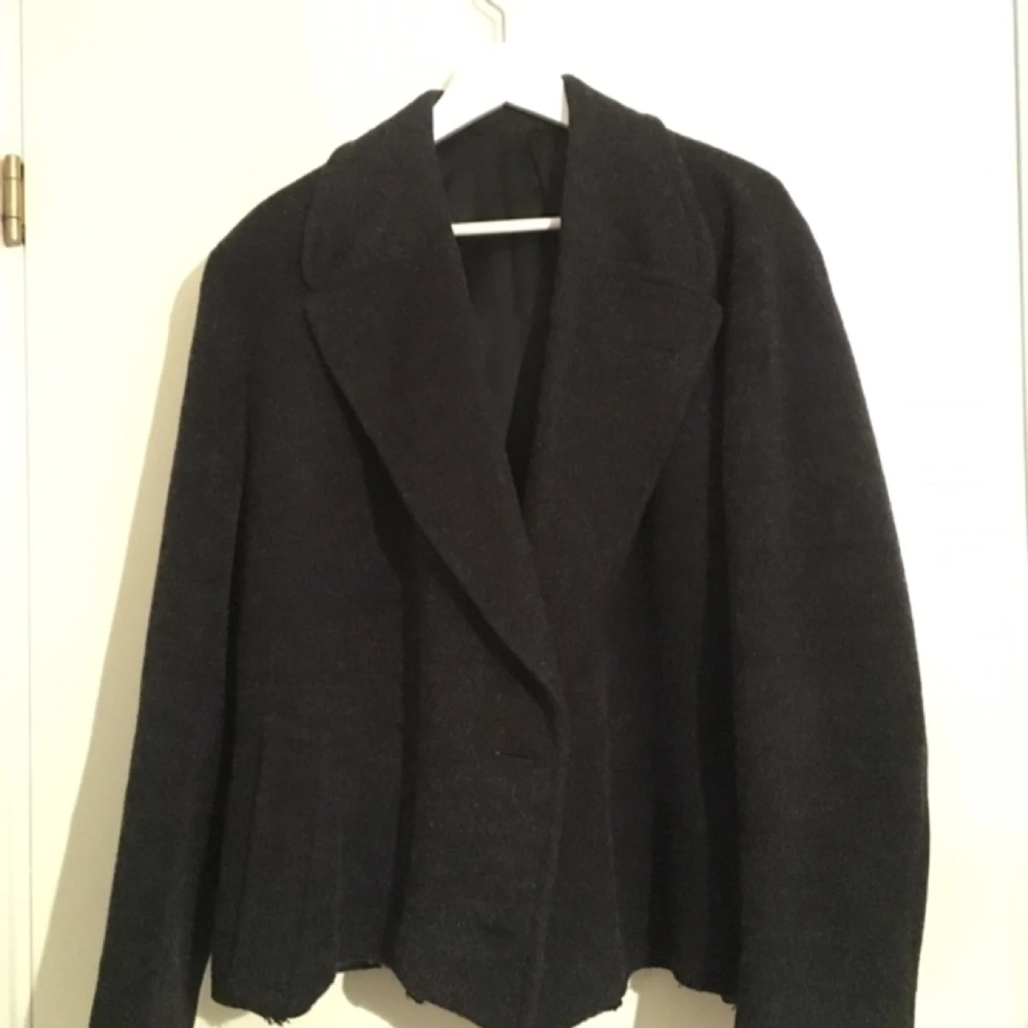 En snygg kappa/jacka med grym struktur. Jag tror att jackan kan vara från herrmodell men jag själv är kvinna så för mig är den unisex. Kappan är på mig stor, jag har stl S och jag skulle chansa att kappan är typ S-M i herrstl. Hur som haver, jag har sytt upp den lite slarvigt så den slutar strax ovanför rumpan. Tyget är typ tovat i färgen svart/marinblått (se tredje bild). Denna kappa håller jag väldigt kärt och är perfekt för den modemedvetna! Jag kan mötas upp i Stockholm eller Dalarna.