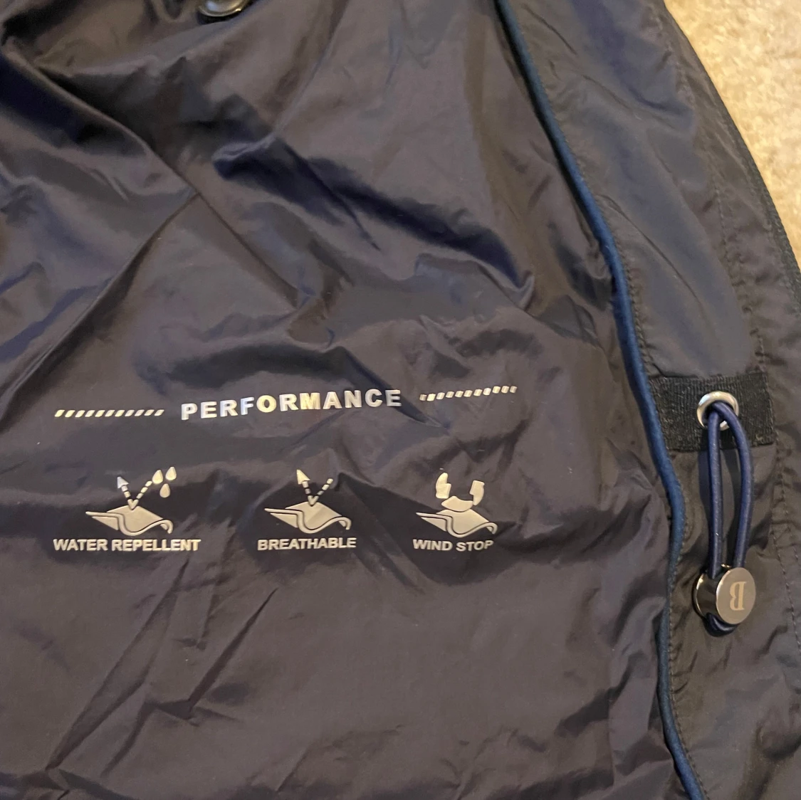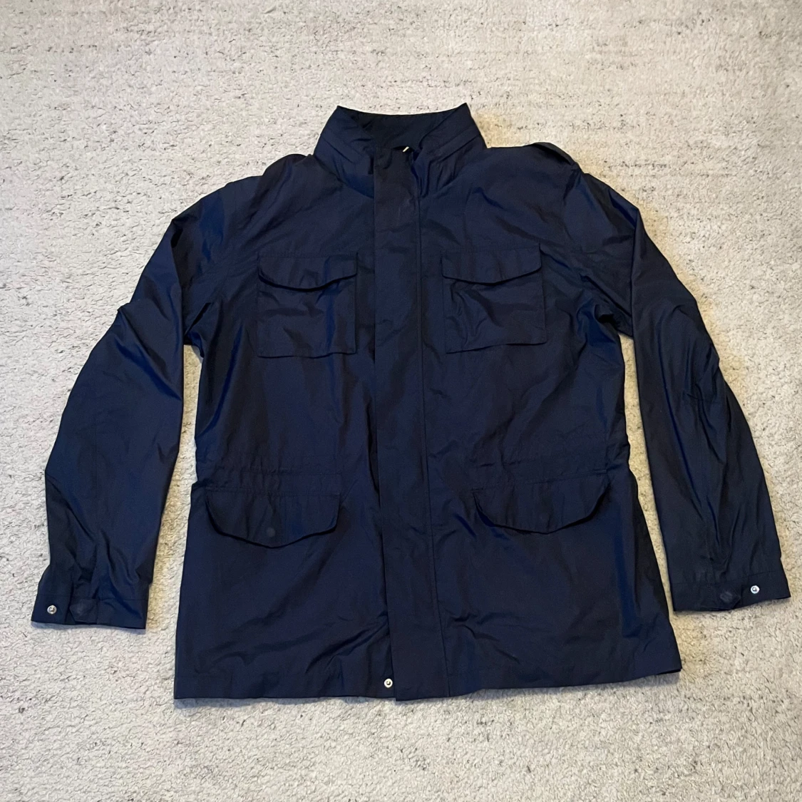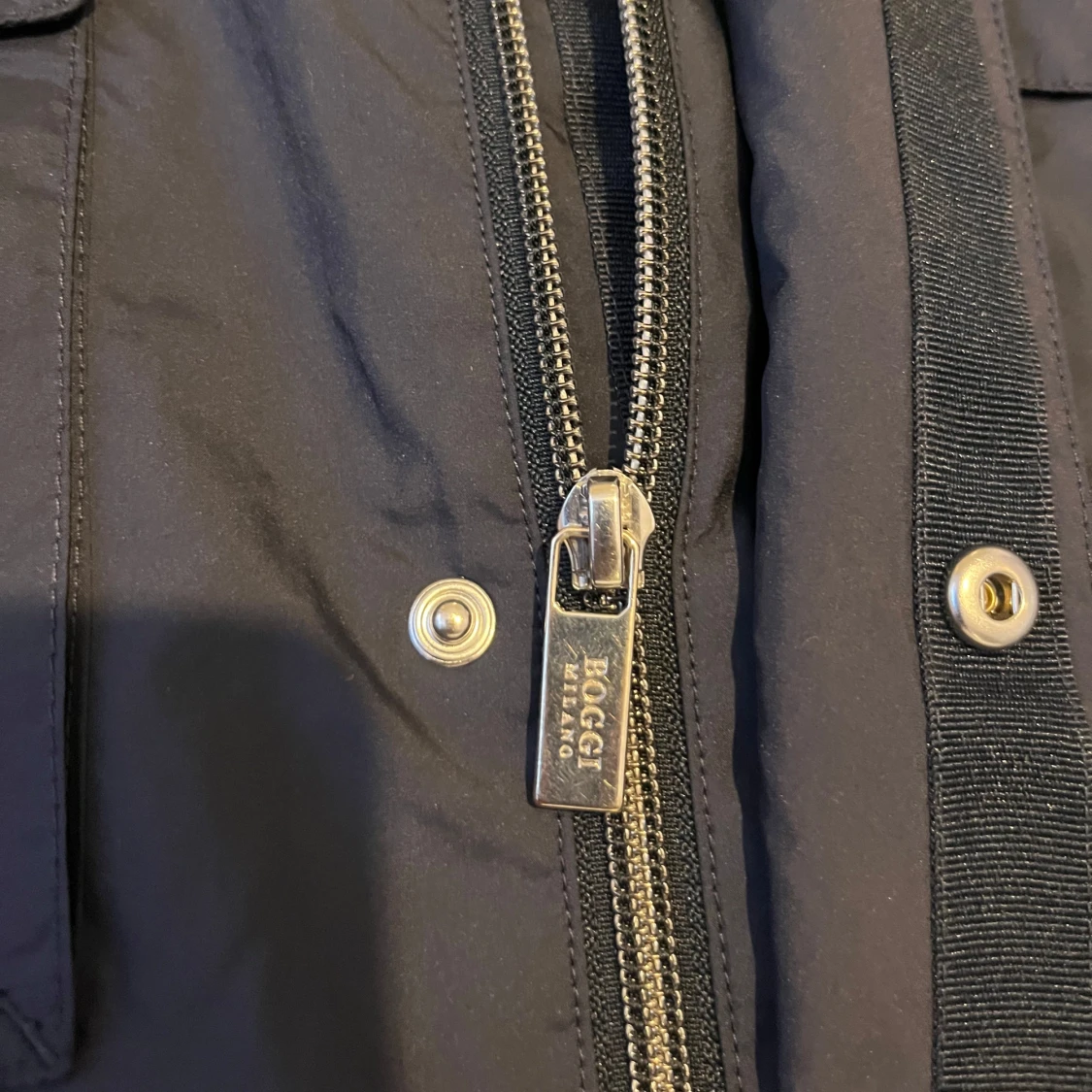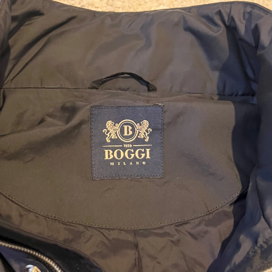 Säljer en snygg lite längre mörkblå jacka från Boggi Milano. Den har en stilren design med dragkedja och knappar framtill. Jackan har flera praktiska fickor och är perfekt för höst och vår. Perfekt för dig som vill ha en klassisk look!