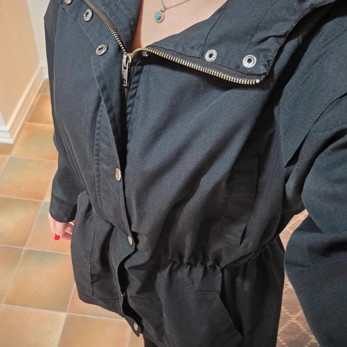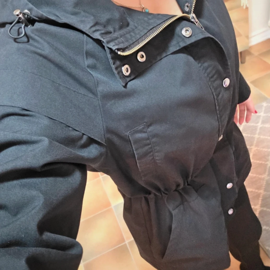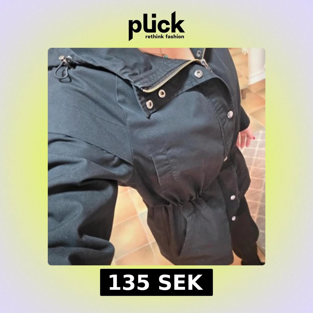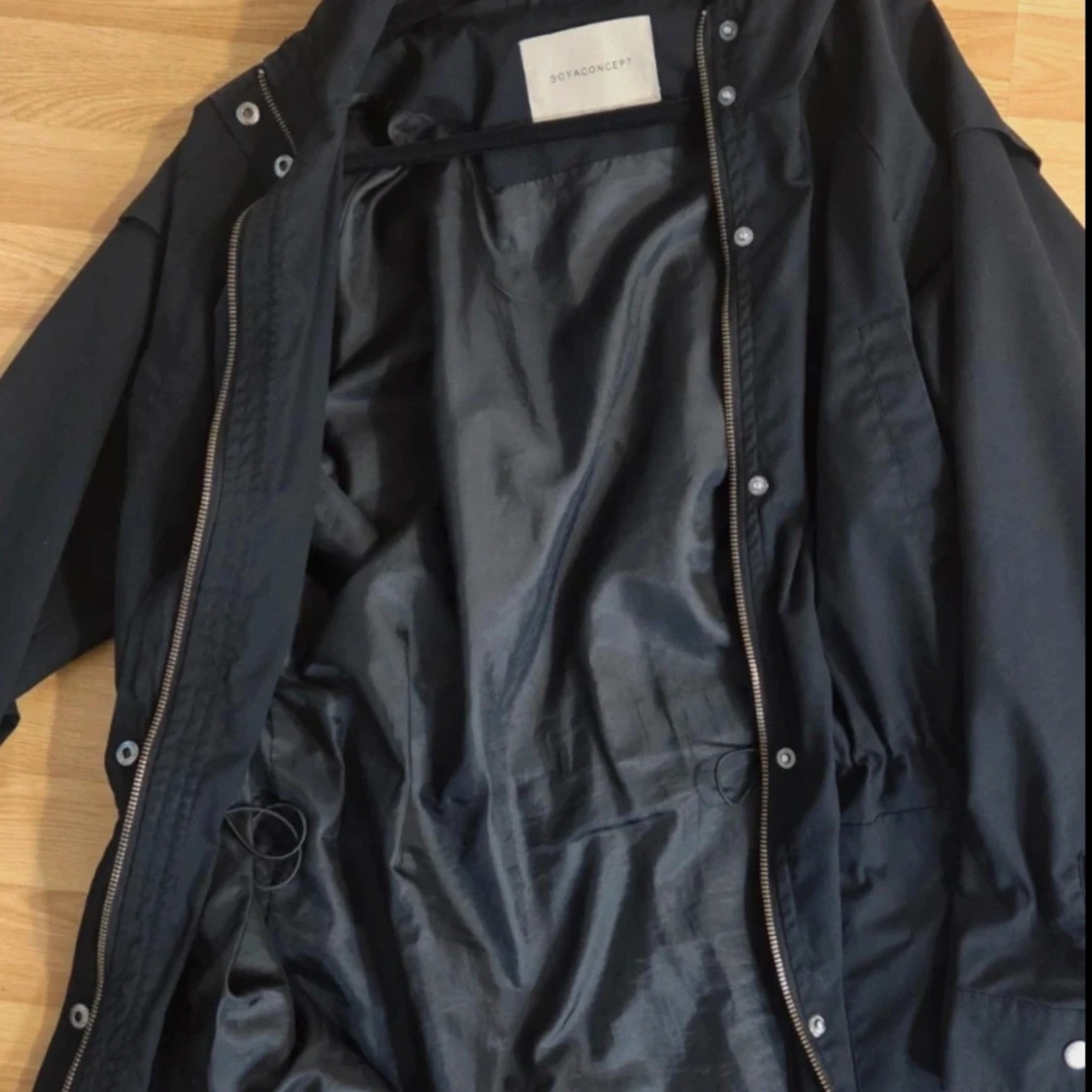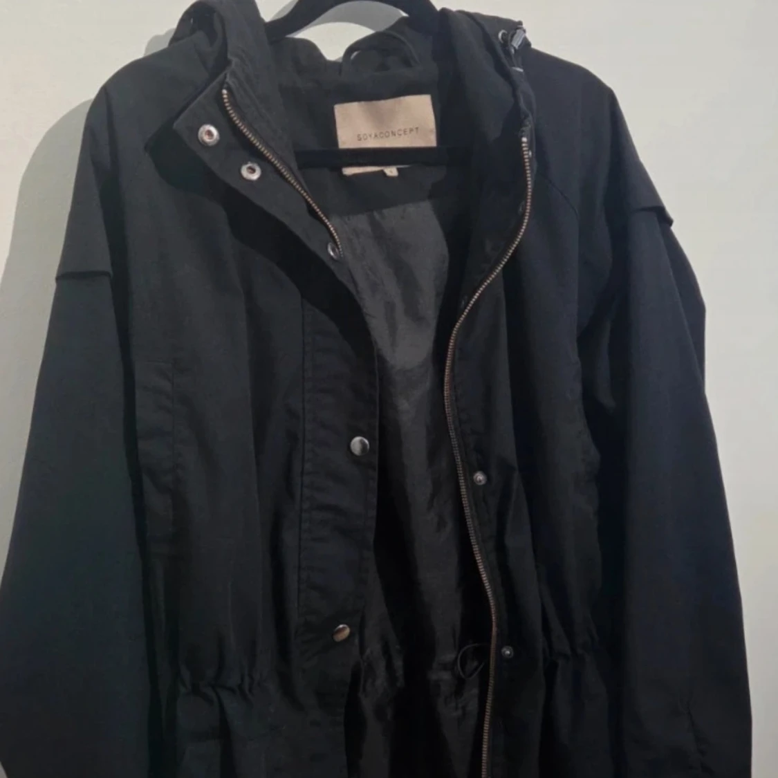 En snygg och praktisk jacka från Soyaconcept, modell SC-LORA. Jackan är lätt, svart och har en huva. Den stängs med dragkedja och tryckknappar. Jackan har en justerbar dragsko i midjan, vilket gör att du kan anpassa passformen och ge den en mer figurnära silhuett. Perfekt som en övergångsjacka under våren eller hösten. Fyra fickor. Två uppe vid brösten och två i midjan. På ärmsluten finns några små, ljusa fläckar som knappt syns, se sista bilden.