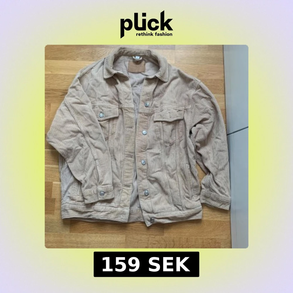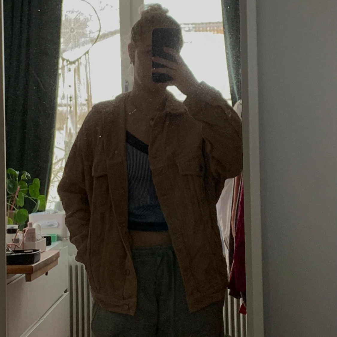 Säljer en snygg beige manchesterjacka från Topshop. Jackan har en klassisk krage, knappar framtill och två bröstfickor med knappar. Perfekt för en avslappnad stil.