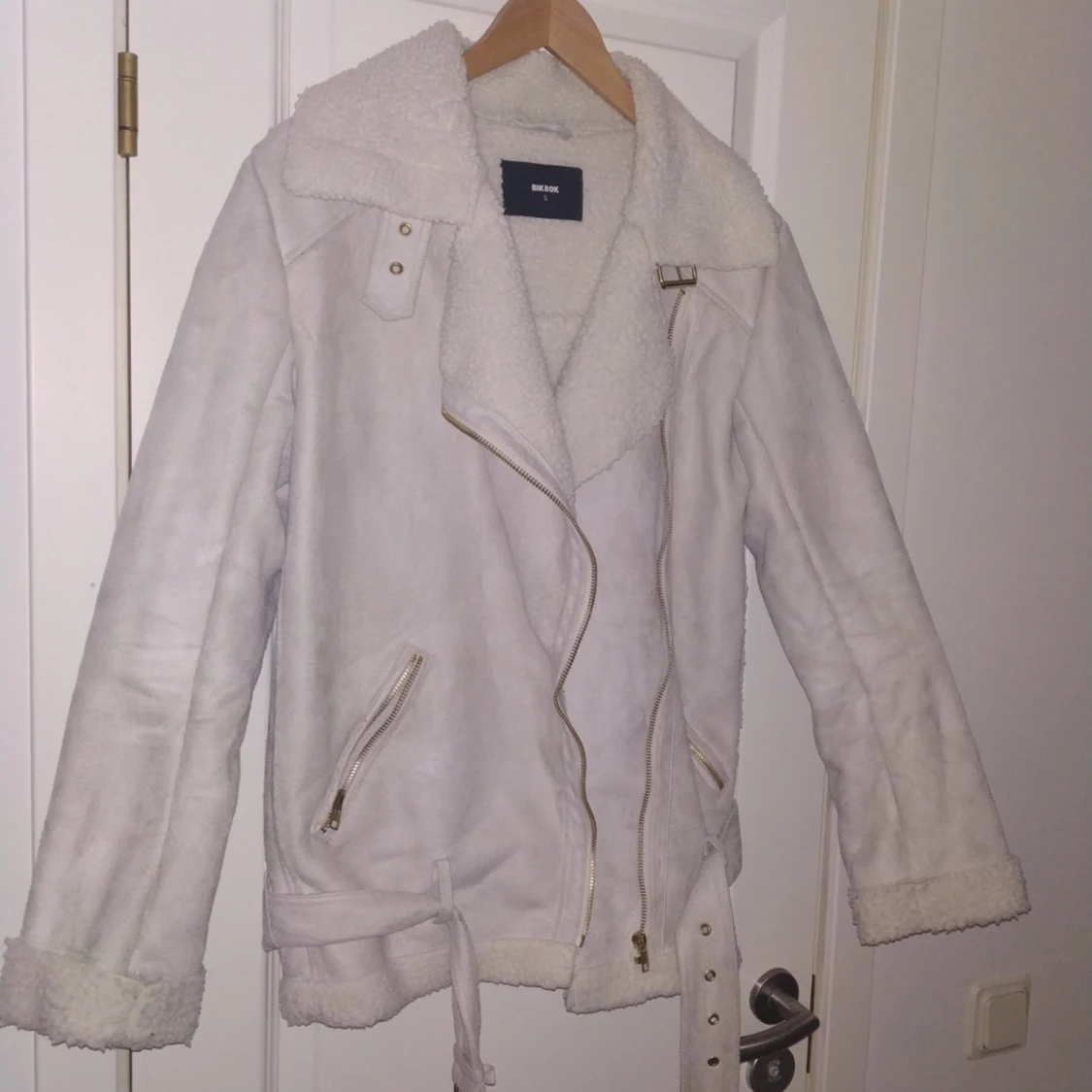 Vinterjacka i biker modell. Vit/grå/beige i färgen. Mocka imitation. Använd 1 gång