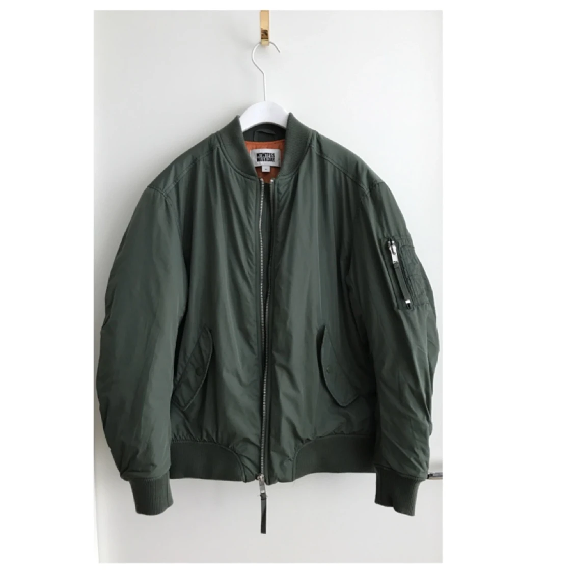 Nästintill oanvänd bomberjacka i superfint skick. klassiskt modell men något oversize. Funkar för en XS-liten medium beroende på hur man vill att den ska sitta. Pris i butik=800kr