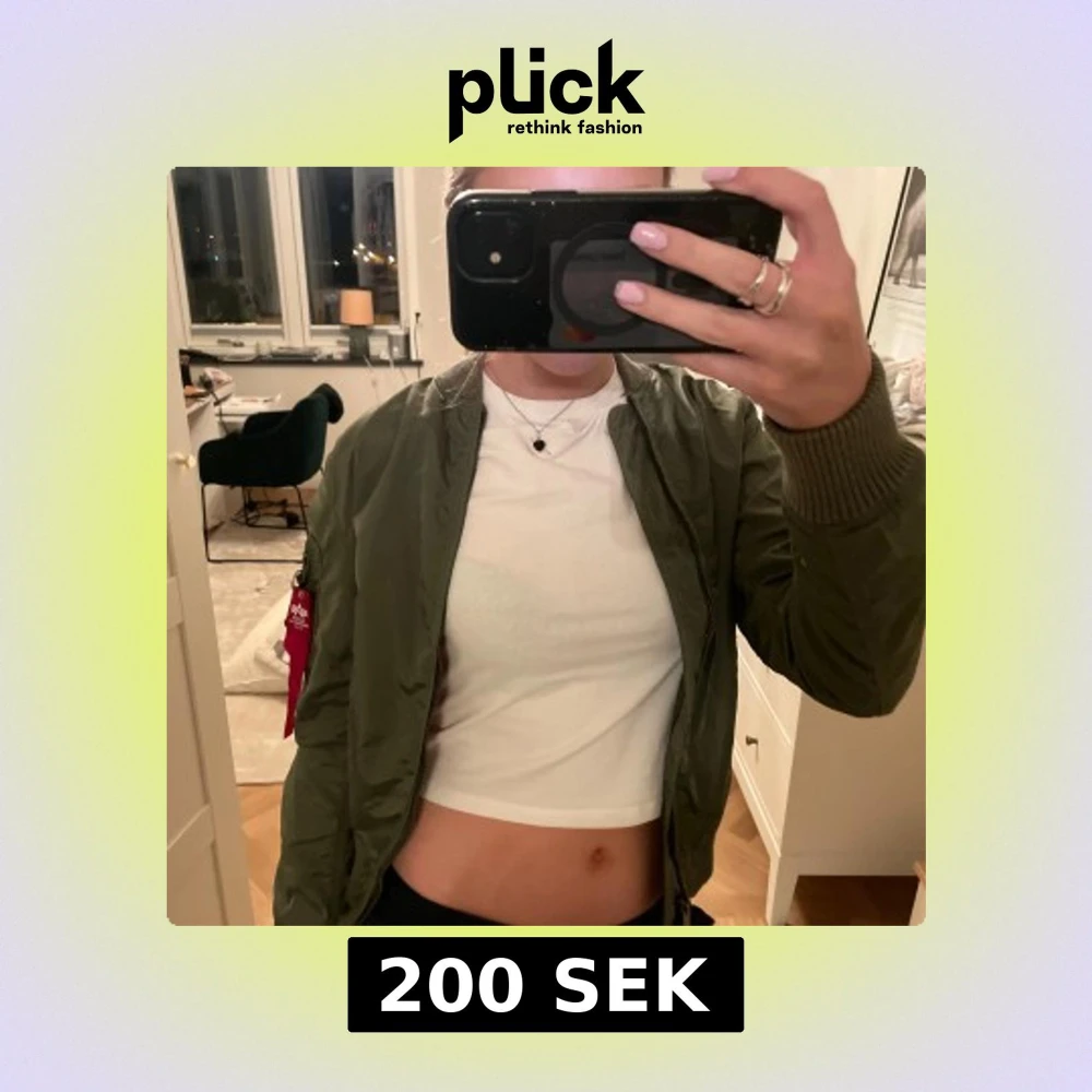 Säljer en snygg grön bomberjacka från Alpha Industries. Jackan har en klassisk design med dragkedja framtill och en praktisk ficka på ärmen med en röd tagg. Perfekt för en cool och avslappnad stil.