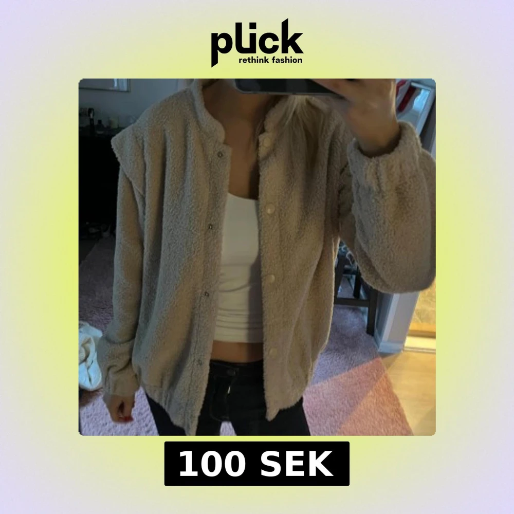 Mysig beige teddyjacka med knappar framtill. Perfekt för kyliga dagar när du vill hålla dig varm och bekväm. Jackan har en avslappnad passform och långa ärmar. Står storlek L på jackan men jag skulle säga att det mer är en S