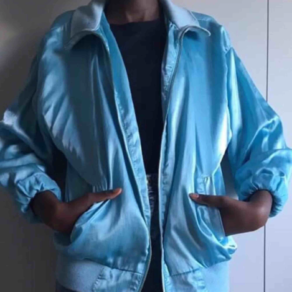 Babyblå bombersjacka i silkes! Köparen står för frakt