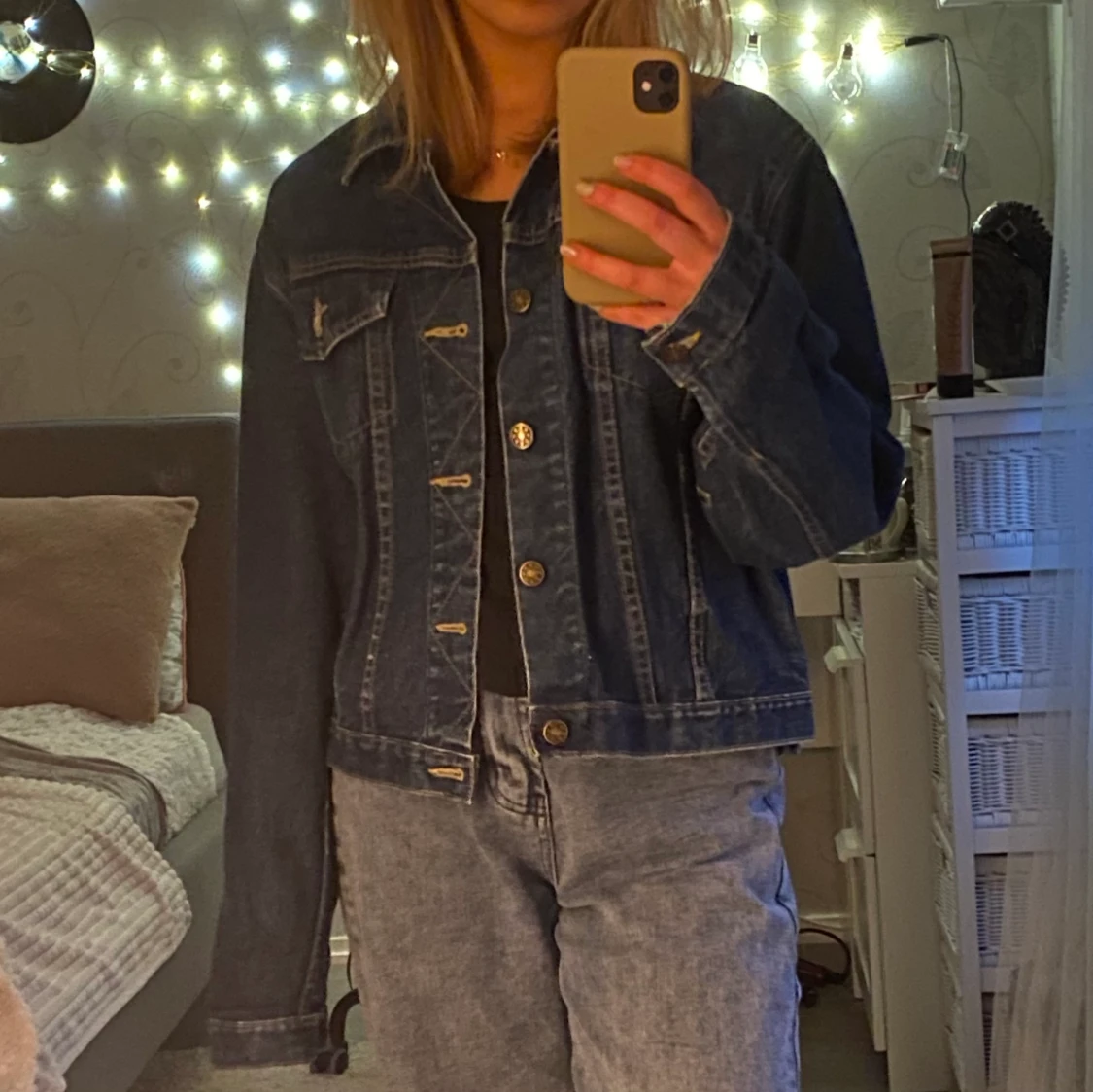 Snygg jeans jacka. Storlek S men kan andvändas mellan xs-M! I bra skick. Färgen är mörkblå och passar till det mesta. 100% bomull