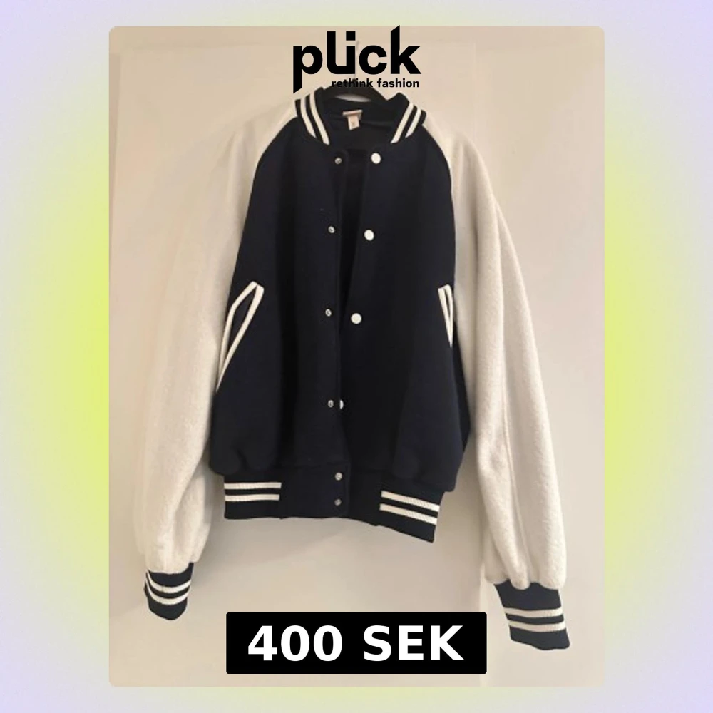 Säljer en snygg bomberjacka i mörkblått med vita ärmar och vita detaljer. Jackan har ribbade muddar och krage med ränder, tryckknappar framtill och två fickor. Materialet är en mix av polyester och bomull, perfekt för dig som vill ha en sportig och cool look.