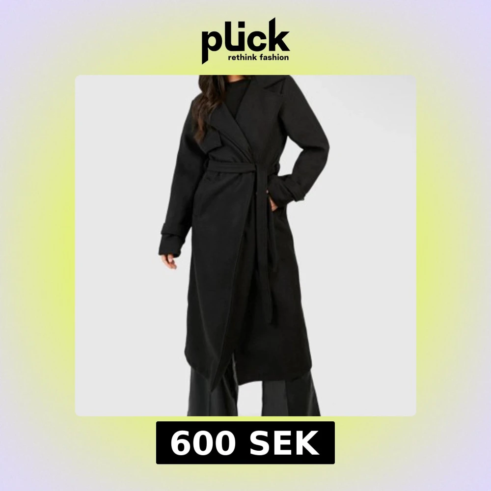 Säljer en svart lång kappa från Boohoo med klassisk krage och bälte i midjan. Kappan har en snygg omlott-design och långa ärmar. Priset går att diskutera vid snabb affär. Endast använd fåtal gånger