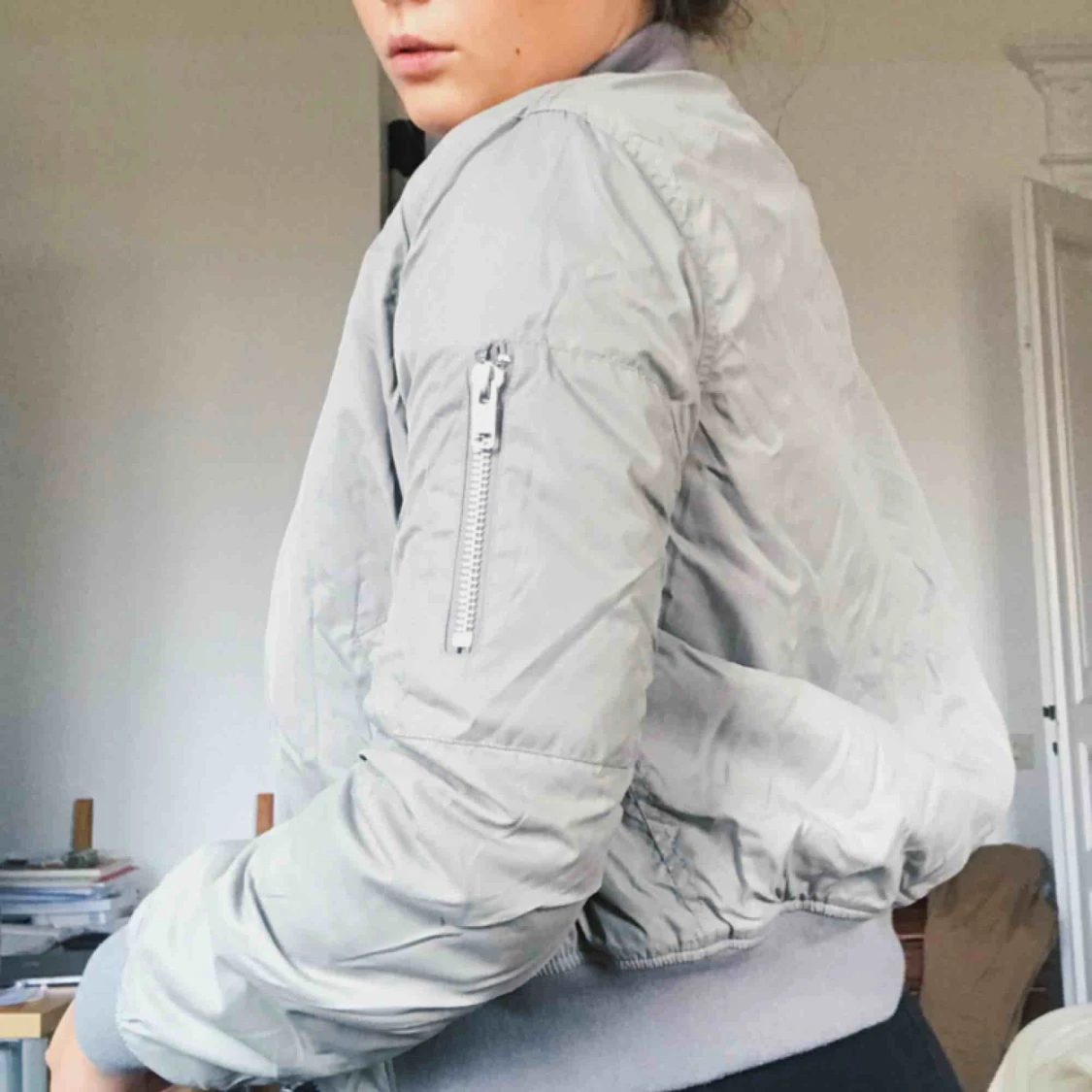 Fräsch bomberjacka i en snygg grå färg, liten i storlek, jag brukar ha 38/40 i jacka men denna skulle passa en 34/36 mer!