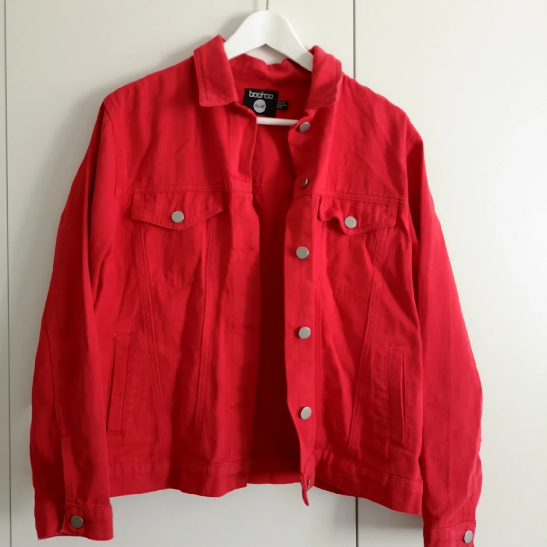 Röd jeansjacka från Boohoo i väldigt bra skick! Skulle säga att storleken är mer som M. I priset ingår frakt 🌻