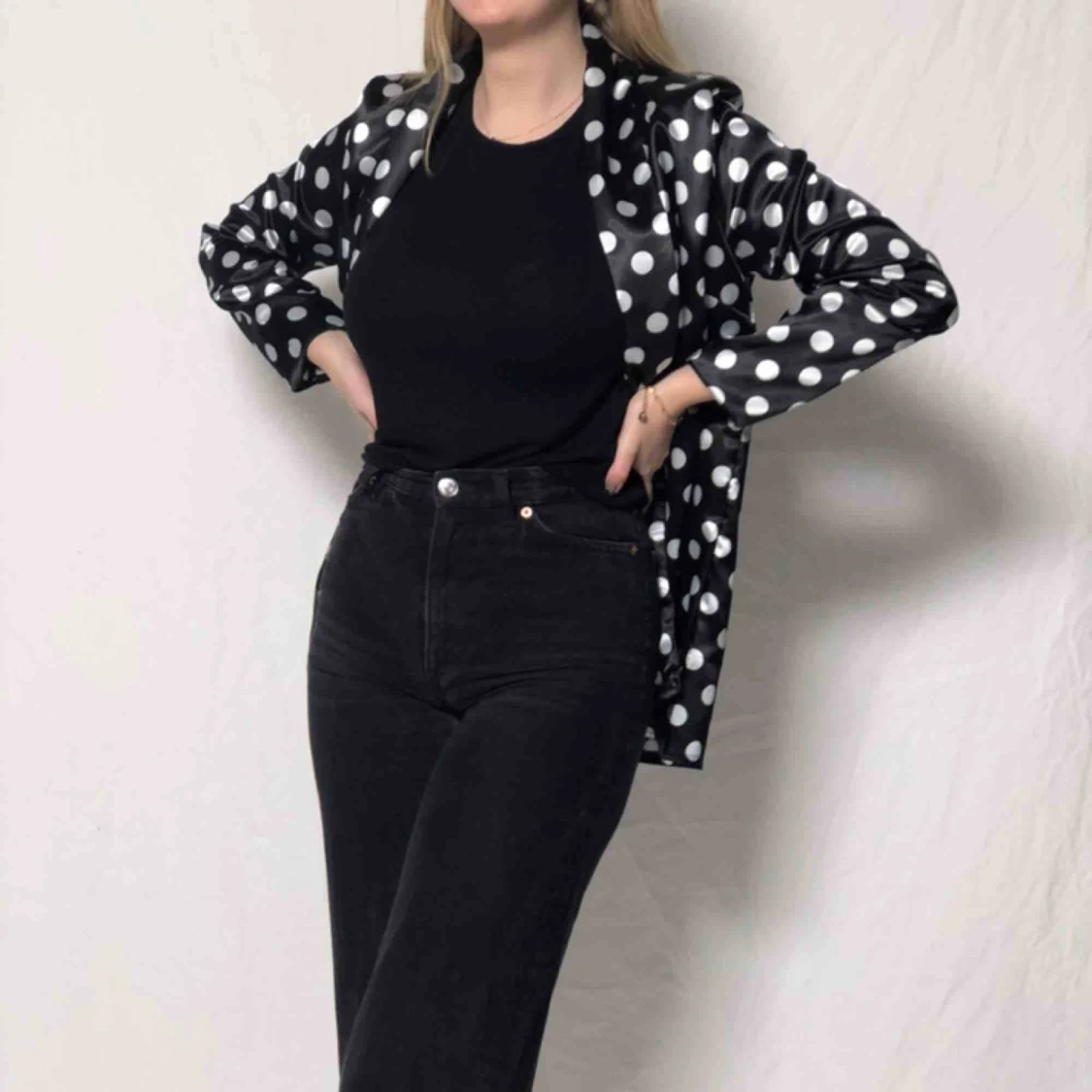 Helt ny svart och vit prickig kavaj/blazer från Boohoo i sidenaktigt material. Mötas upp i Malmö annars står köparen för frakten. Frakt: 40kr