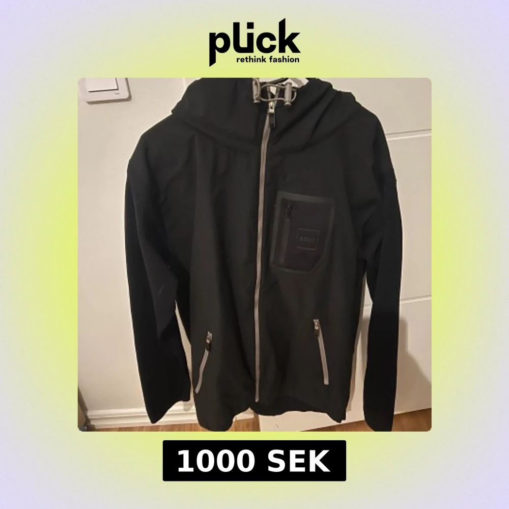 Svart vindjacka från Boss med grå dragkedjor, huva och praktiska fickor framtill. Jackan har en bröstficka med Boss-logga och justerbar dragsko vid huvan. Perfekt för blåsiga dagar och snygg till streetwear.