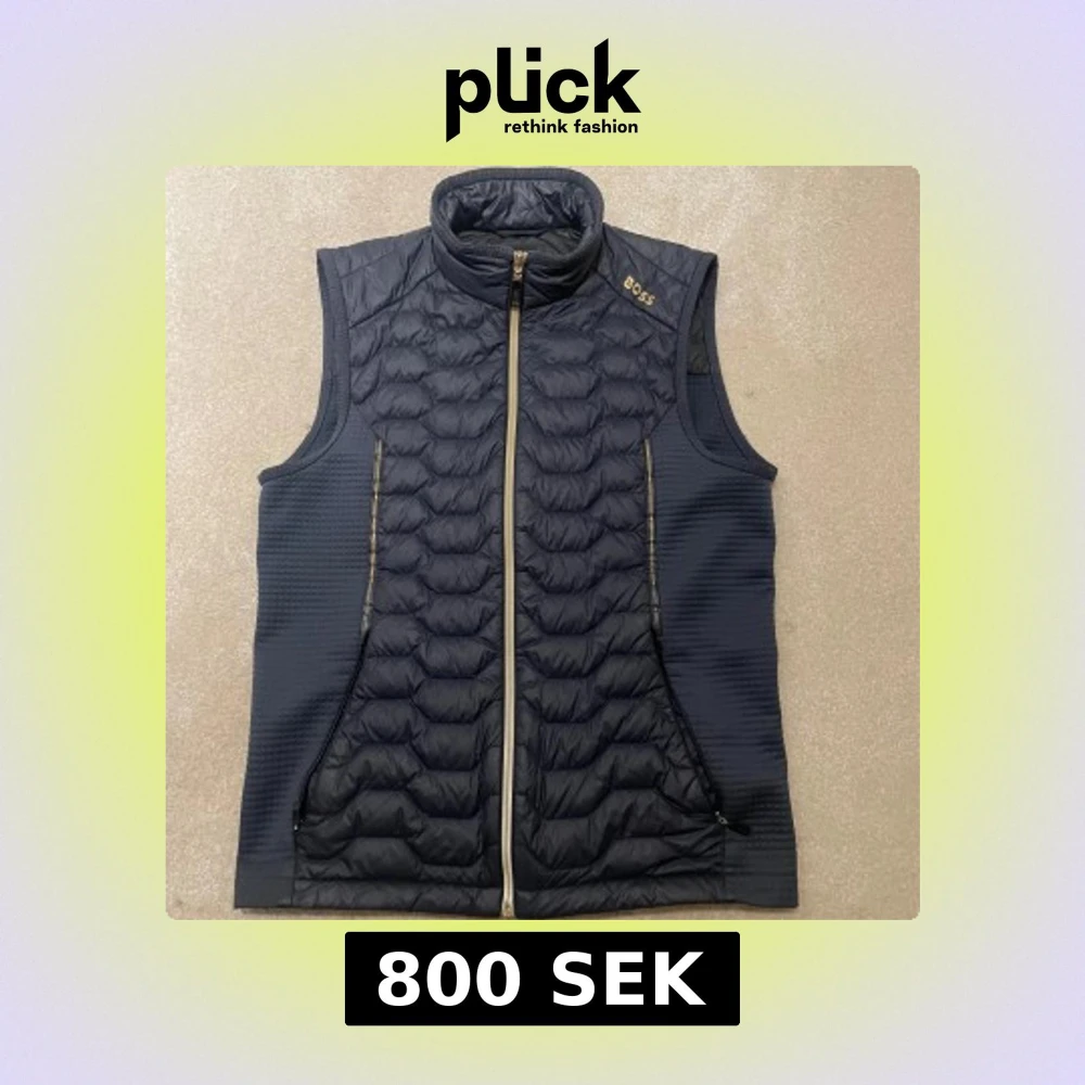Marinblå svart dunväst från BOSS med quiltad framsida och dragkedja hela vägen. Västen har hög krage och diskret BOSS-logga på bröstet. Perfekt att bära över en tröja för extra värme och stil.