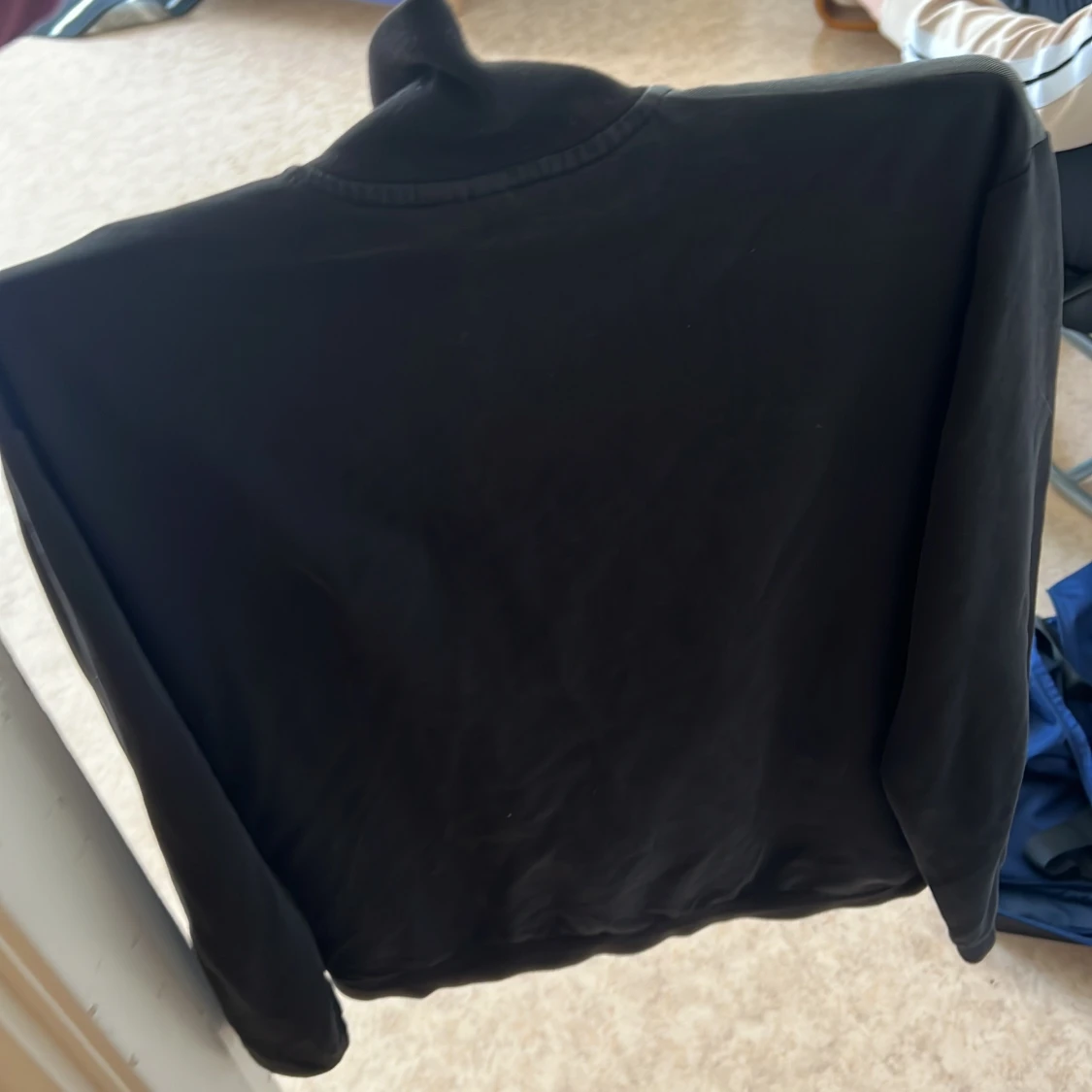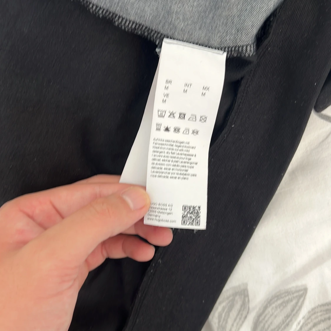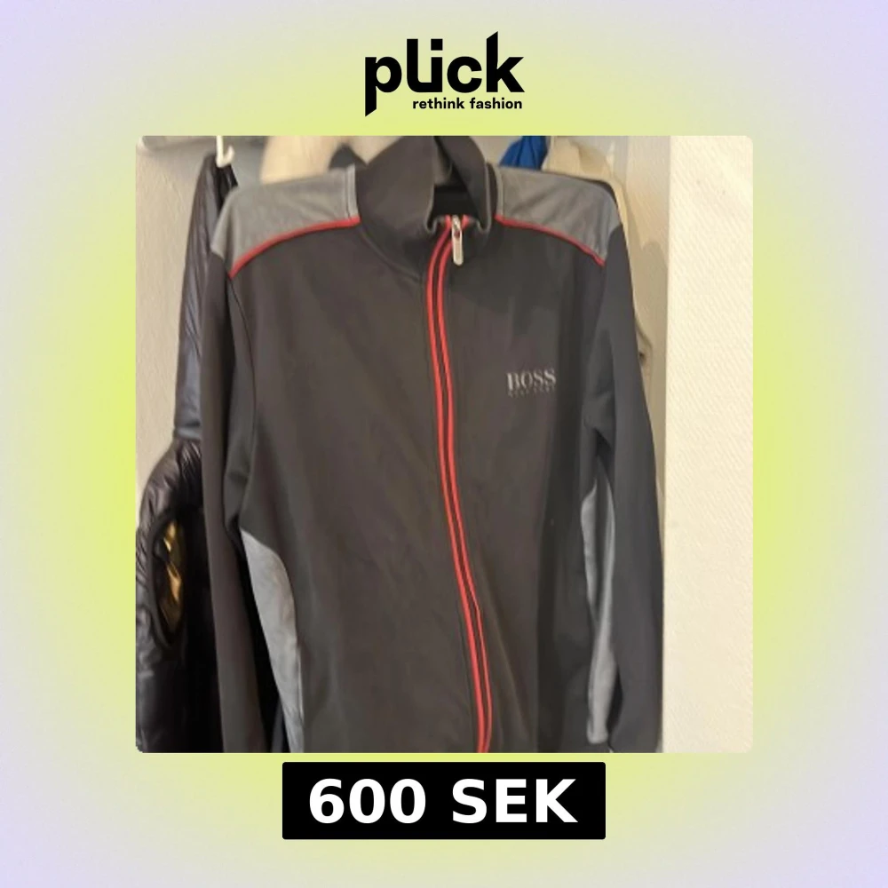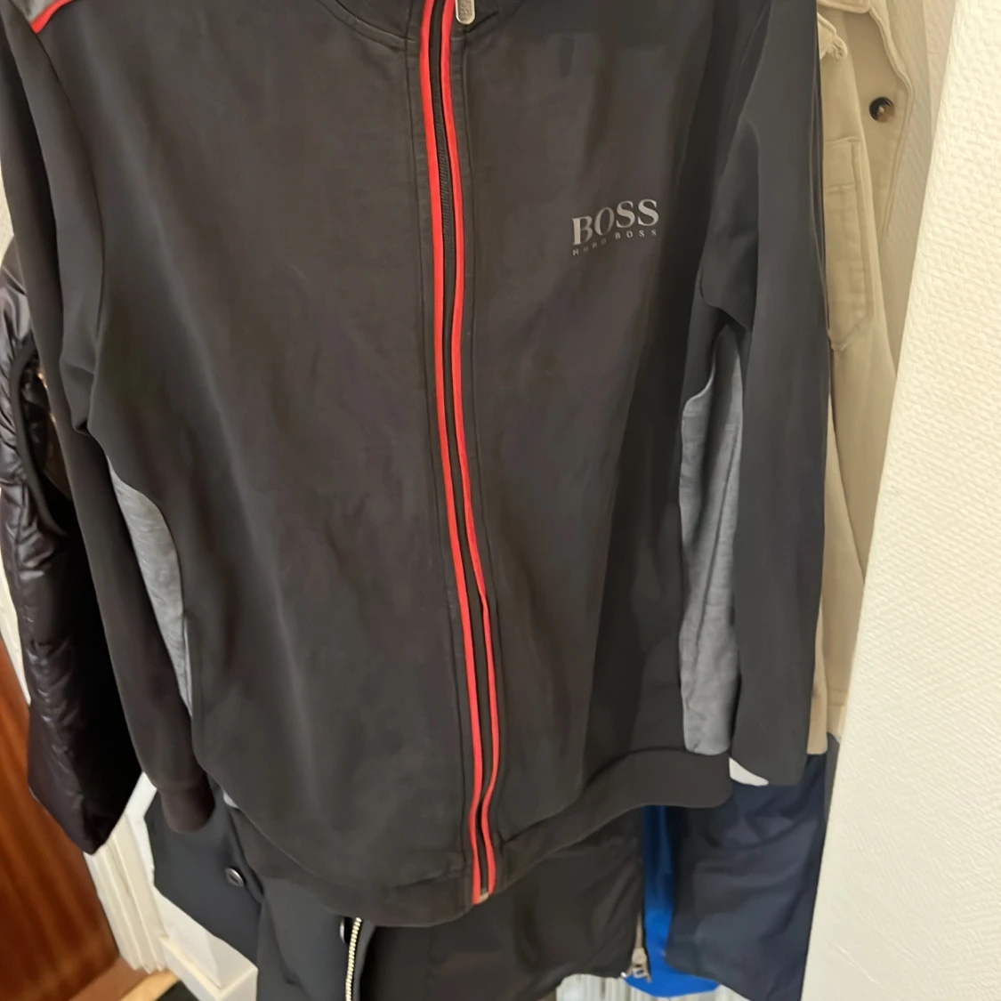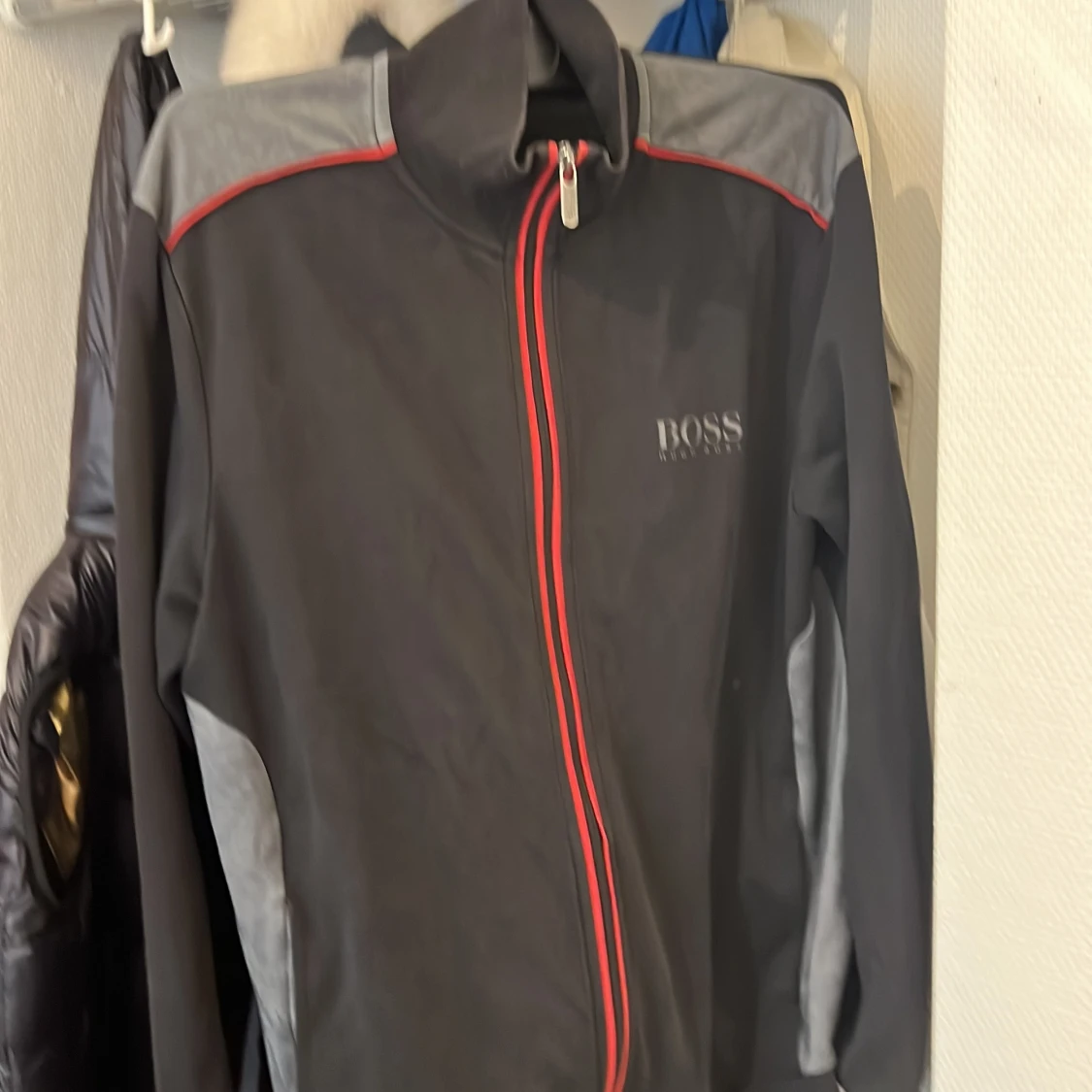 Säljer en stilren svart jacka från Boss med grå och röda detaljer. Jackan har en dragkedja framtill och långa ärmar. Perfekt för en casual look.