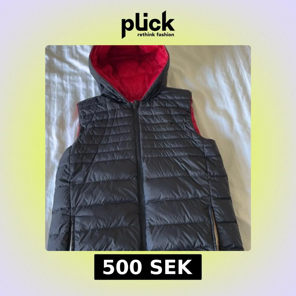 Snygg och praktisk vändbar dunväst i svart och rött med huva. Västen har en dragkedja framtill och är quiltad för extra värme. Perfekt för kyliga dagar! Den är nästan helt ny knappt använd o säljs för bra pris vilket går o diskutera