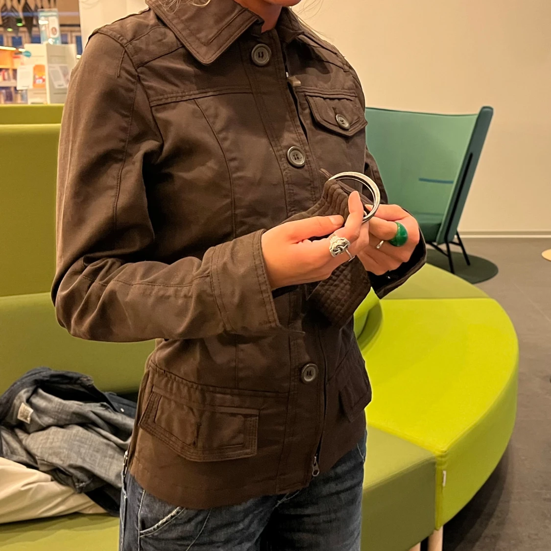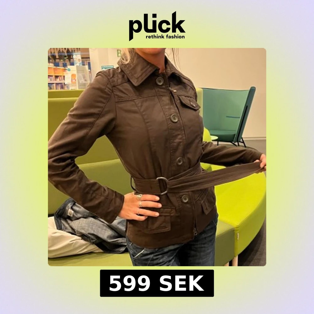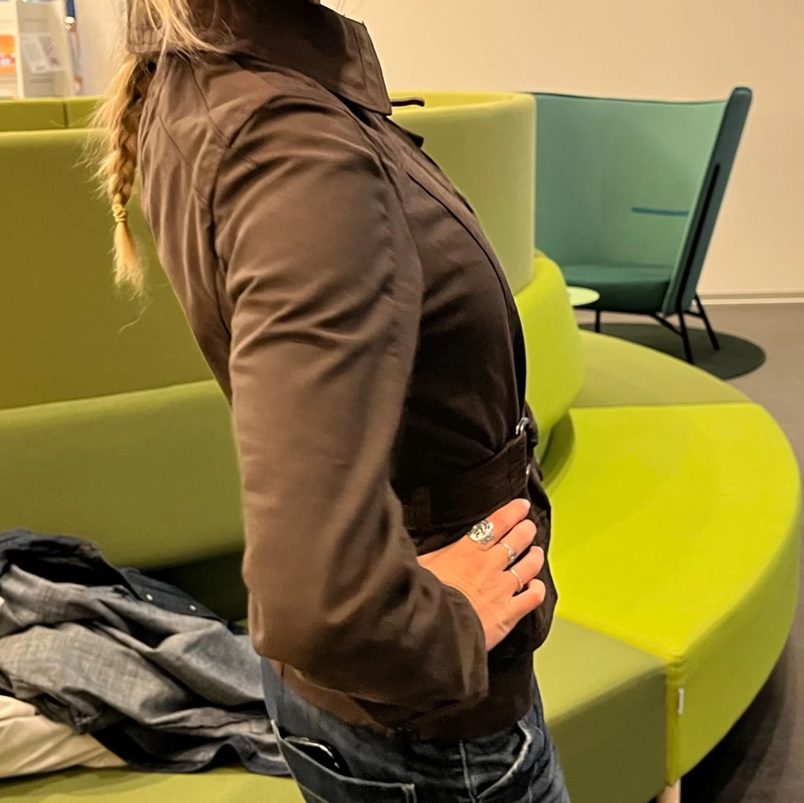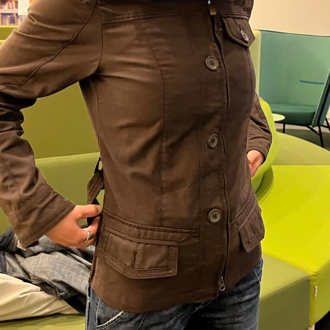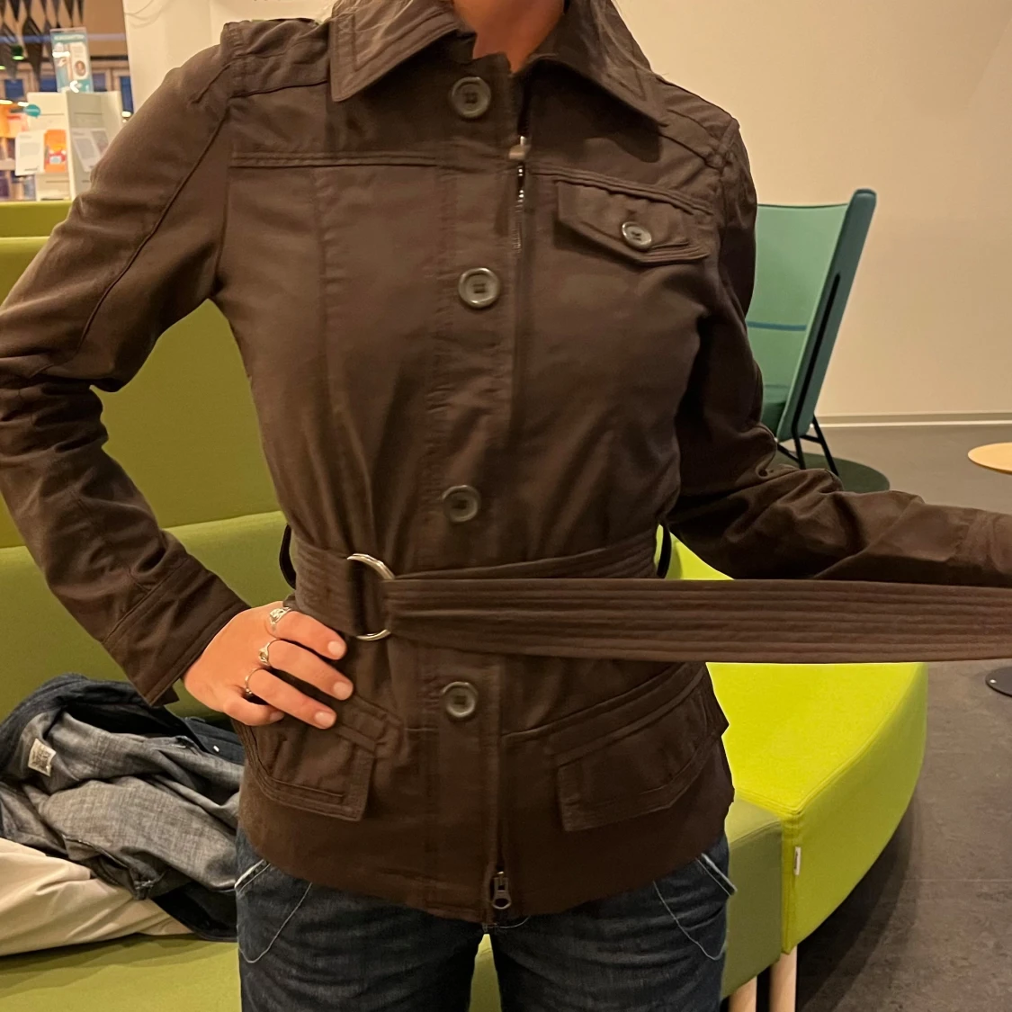 Snygg brun jacka med markerad midja tack vare det breda bältet med metallspänne. Jackan har klassisk krage, stora knappar framtill, bröstficka med lock och två sidfickor. Perfekt för dig som gillar stilren och enkel design.