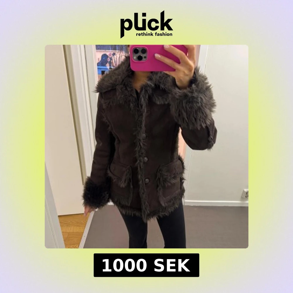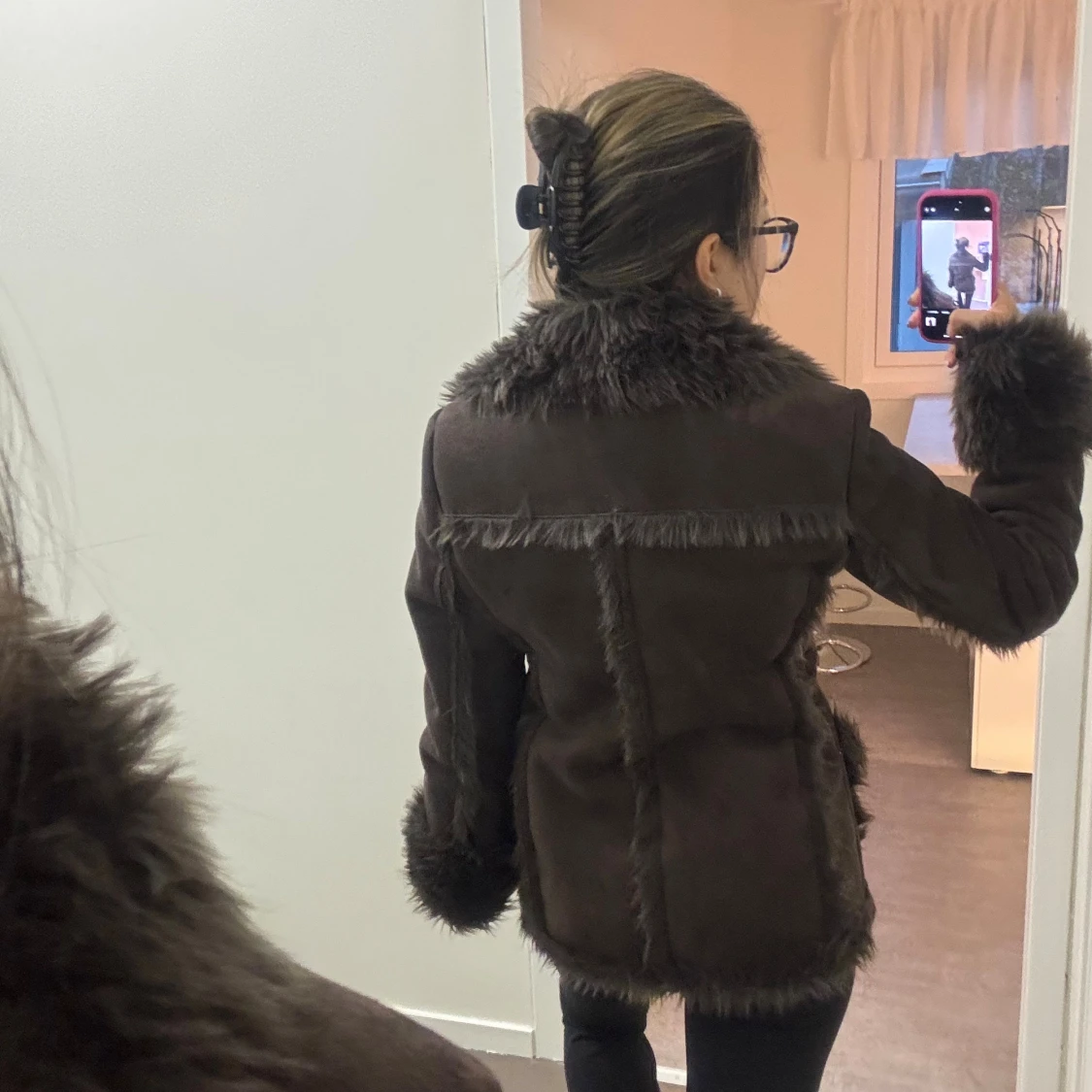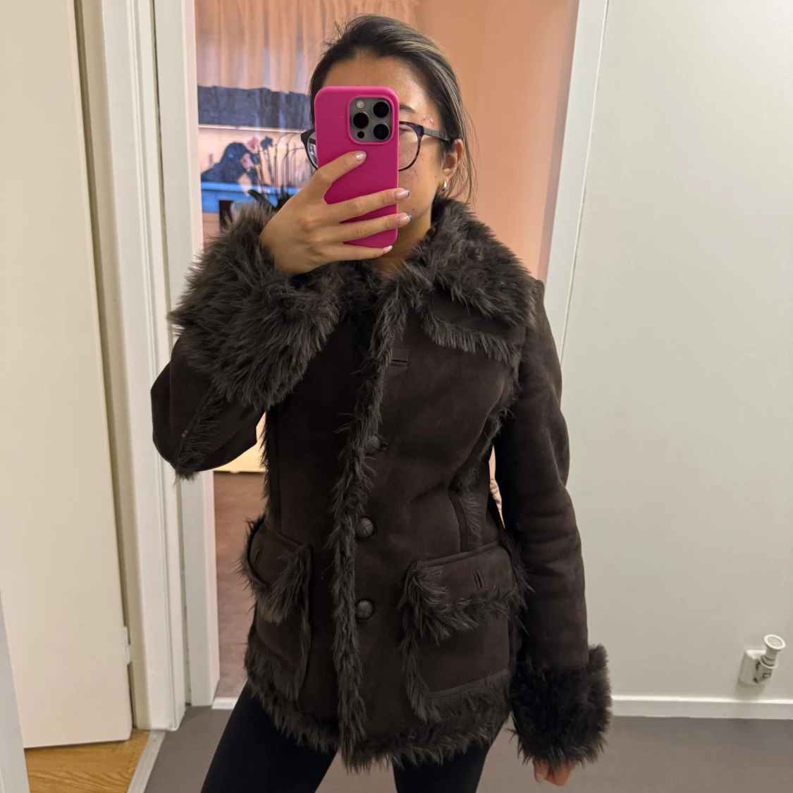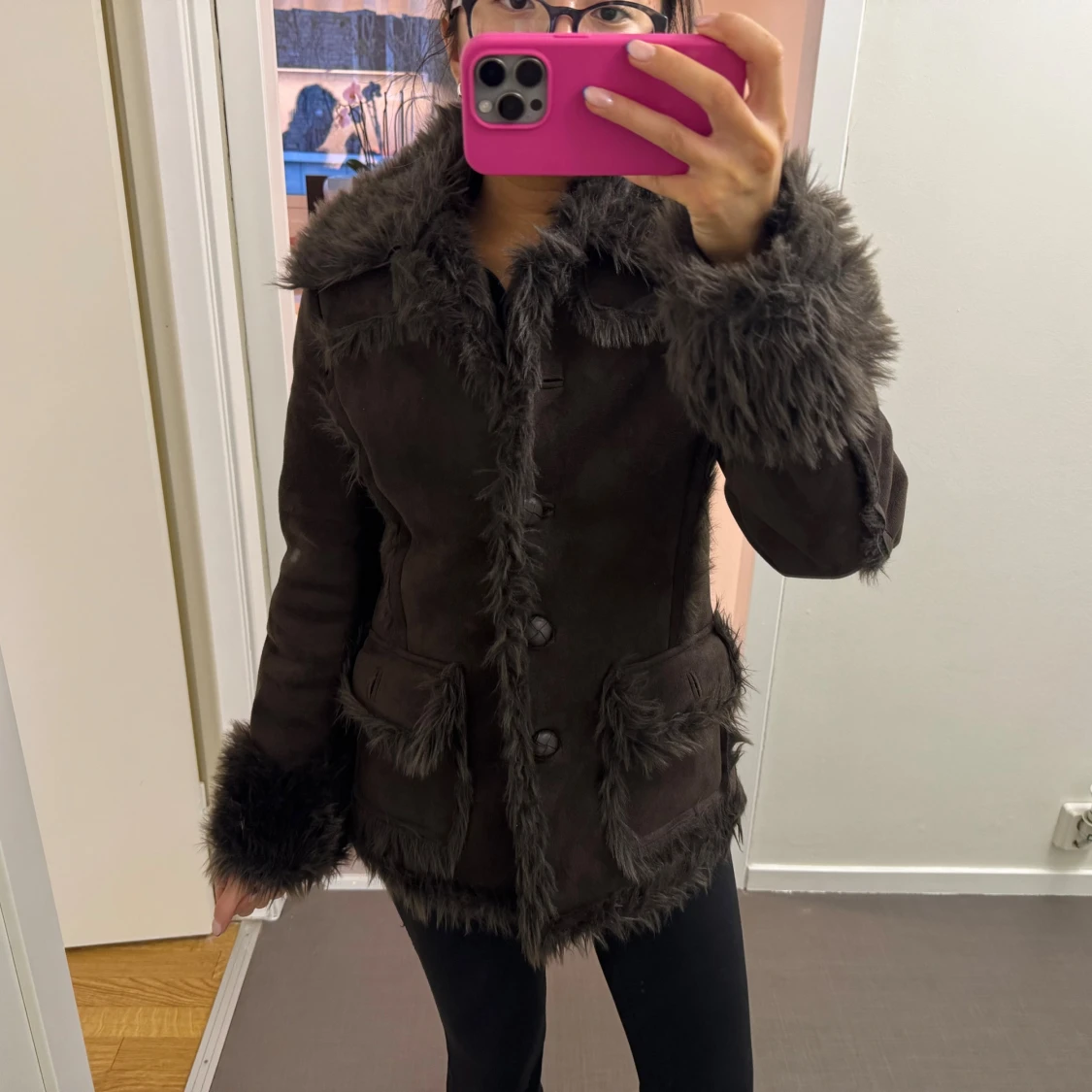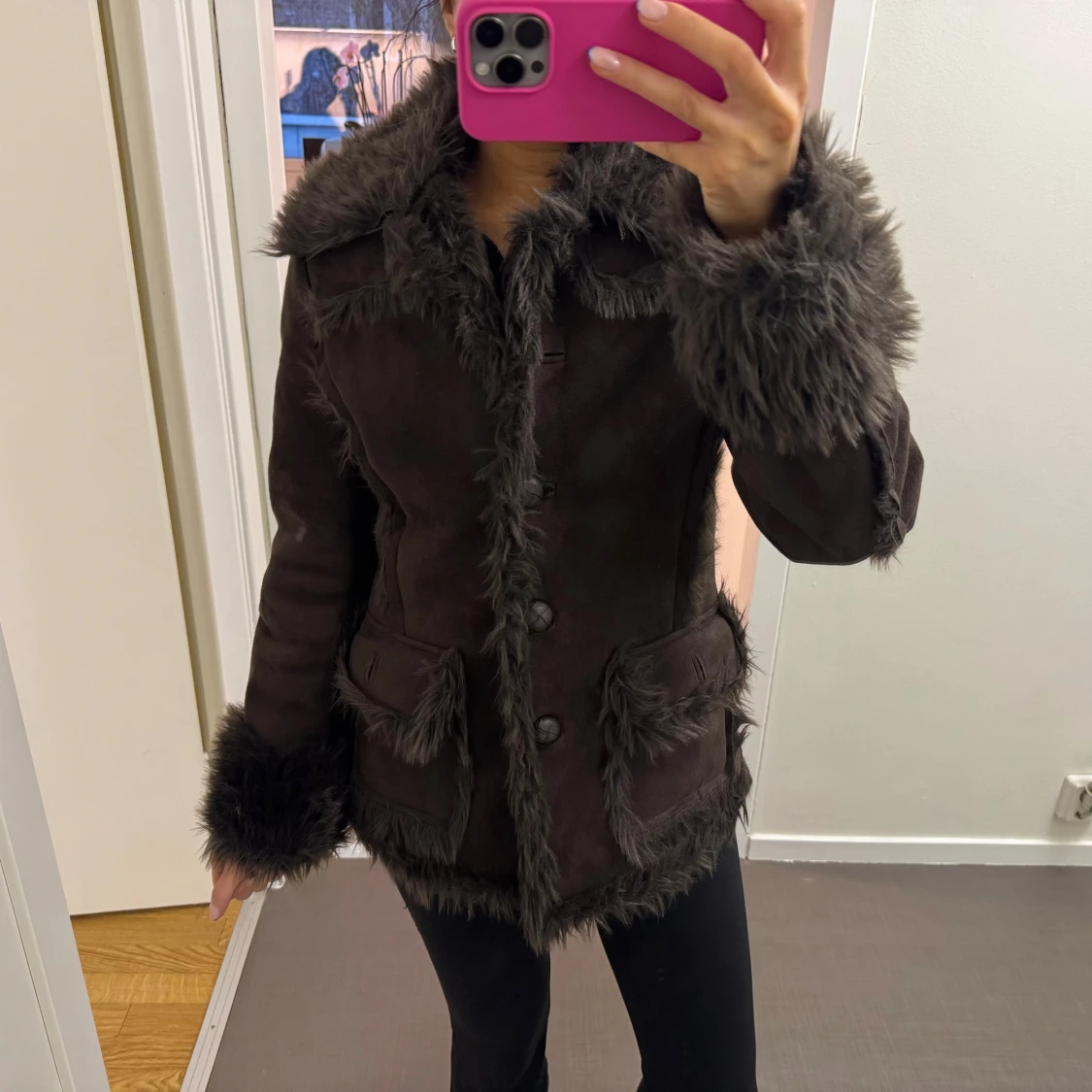 Säljer en brun pälsjacka med fluffiga fuskpälsdetaljer på krage, ärmslut, fickor och längs kanterna. Jackan har stora knappar framtill och två fickor. Perfekt skick
