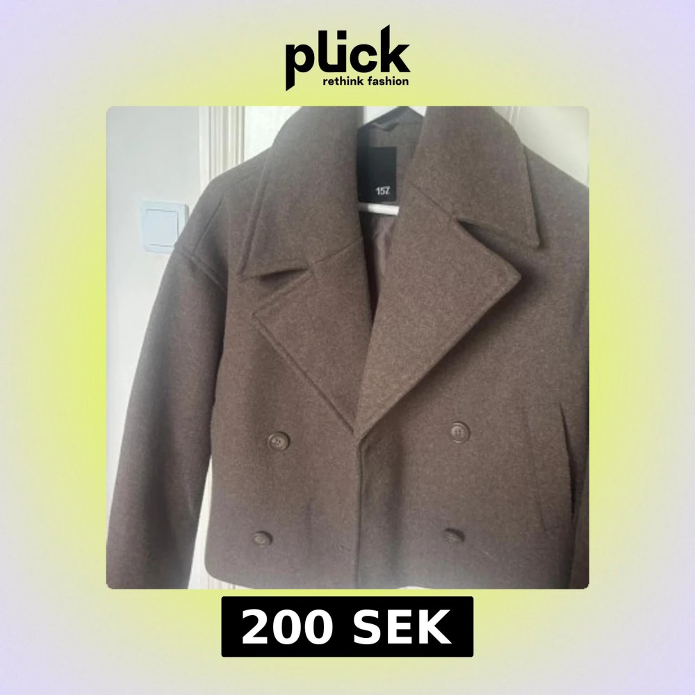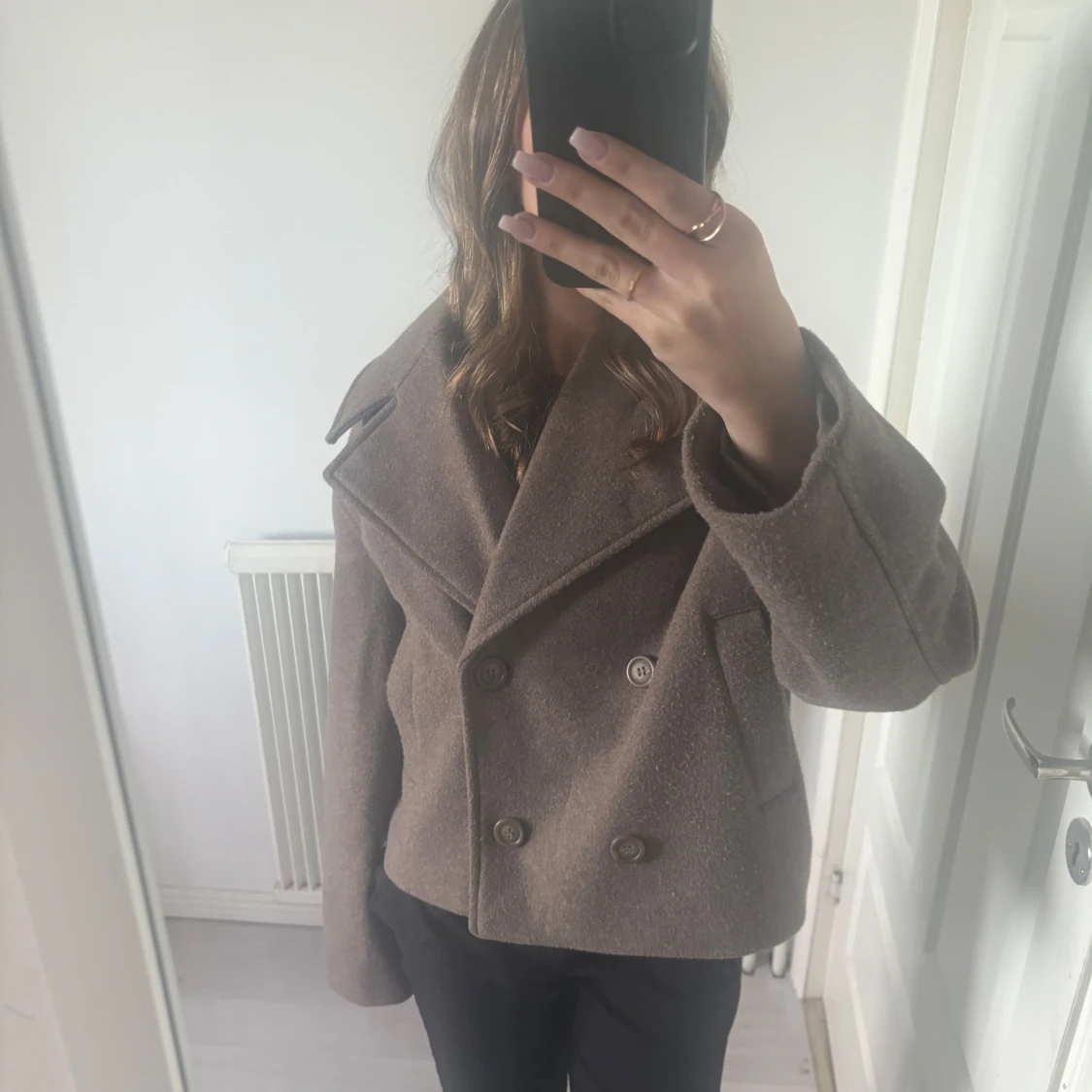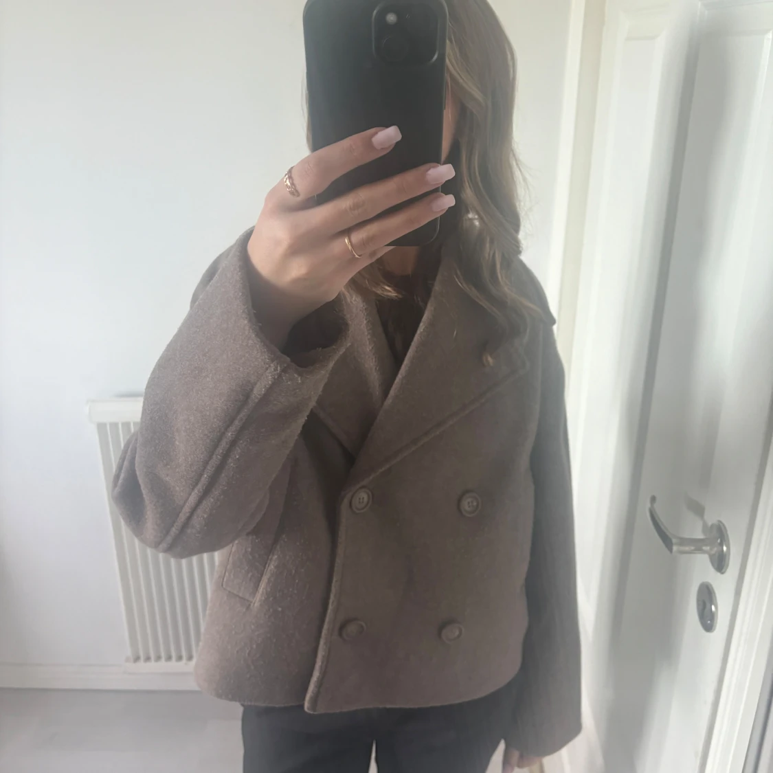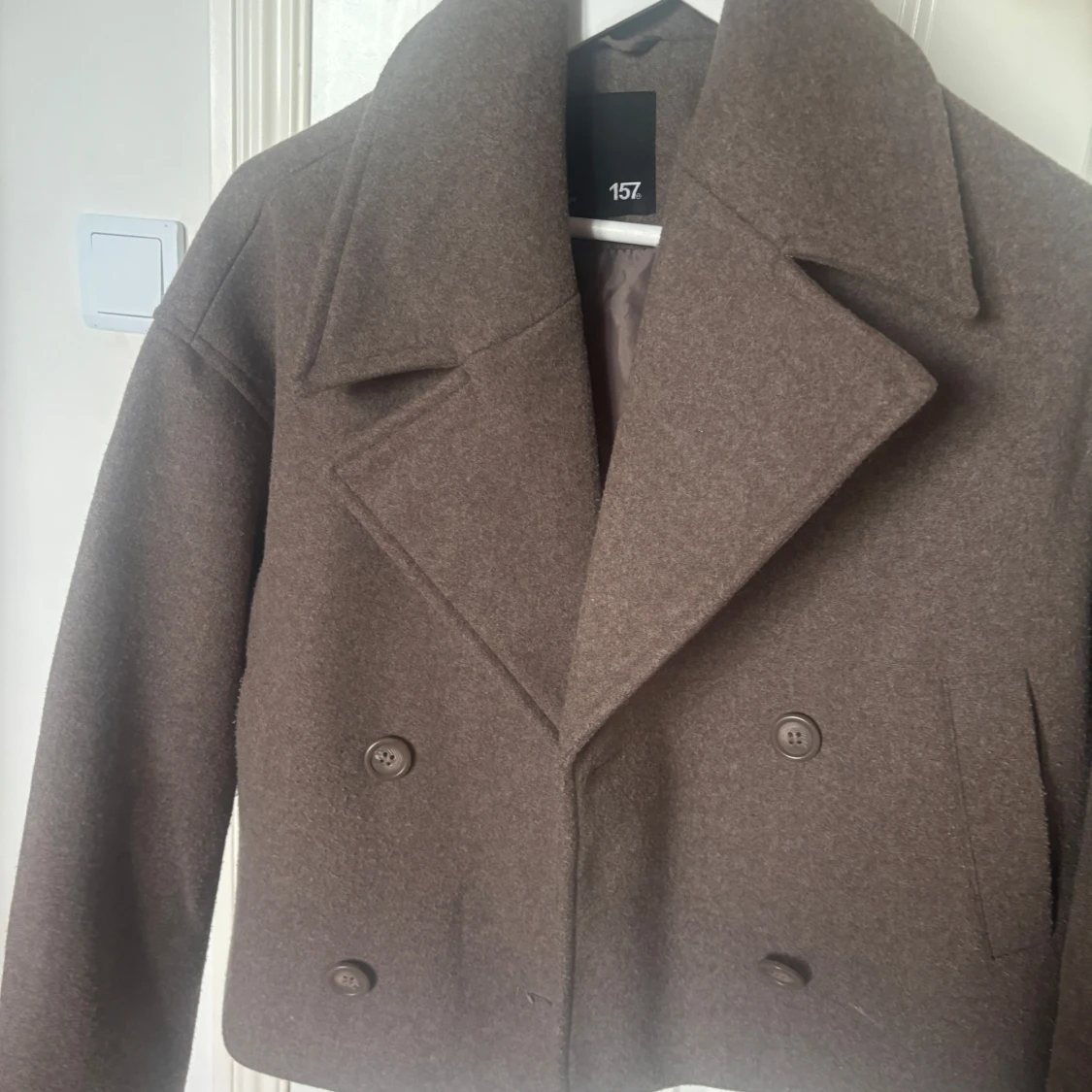 Säljer en stilren brun kappa från 157. Jackan har en dubbelknäppt design med stora slag och en croppad passform. Perfekt för höst och vår.