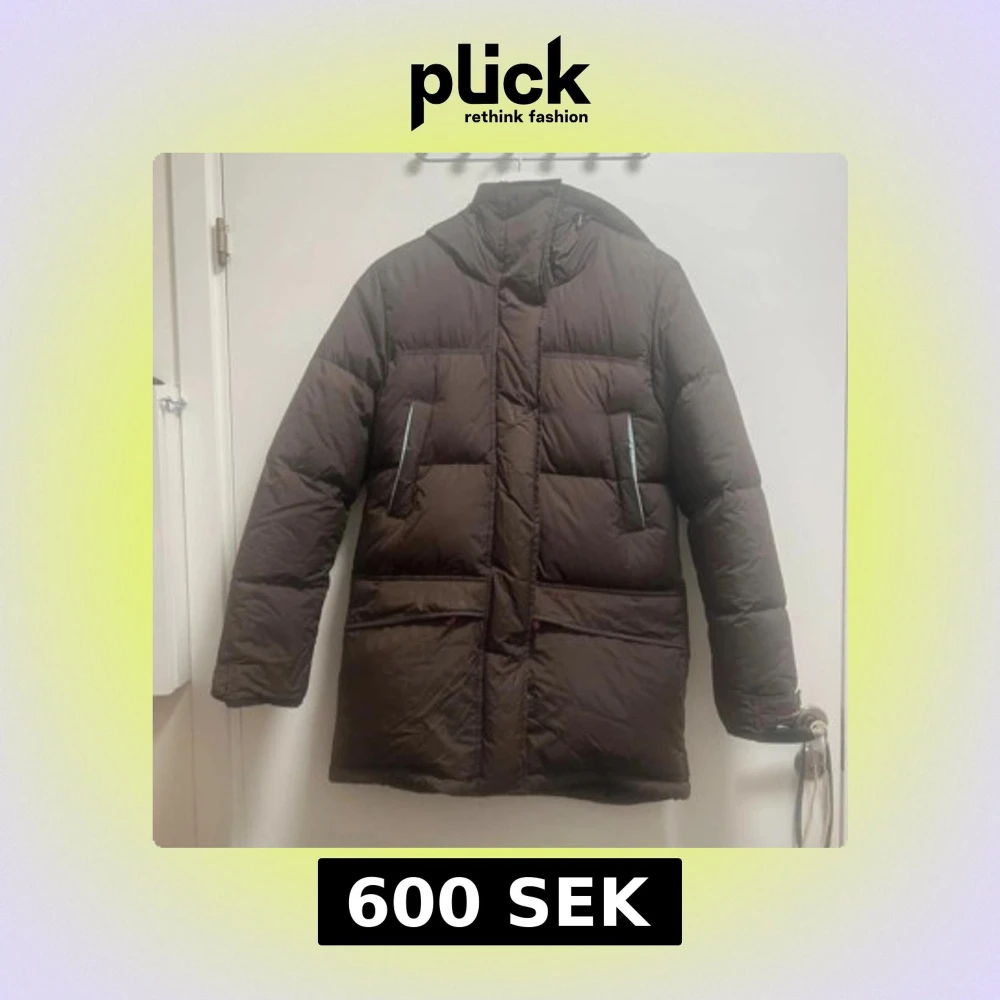 Säljer en brun, lång dunjacka från peak performance med huva och svarta detaljer på insidan. Jackan har quiltad design, dragkedja och knappar framtill samt praktiska fickor med dragkedja. Perfekt för kalla dagar och har en clean, stilren look.
