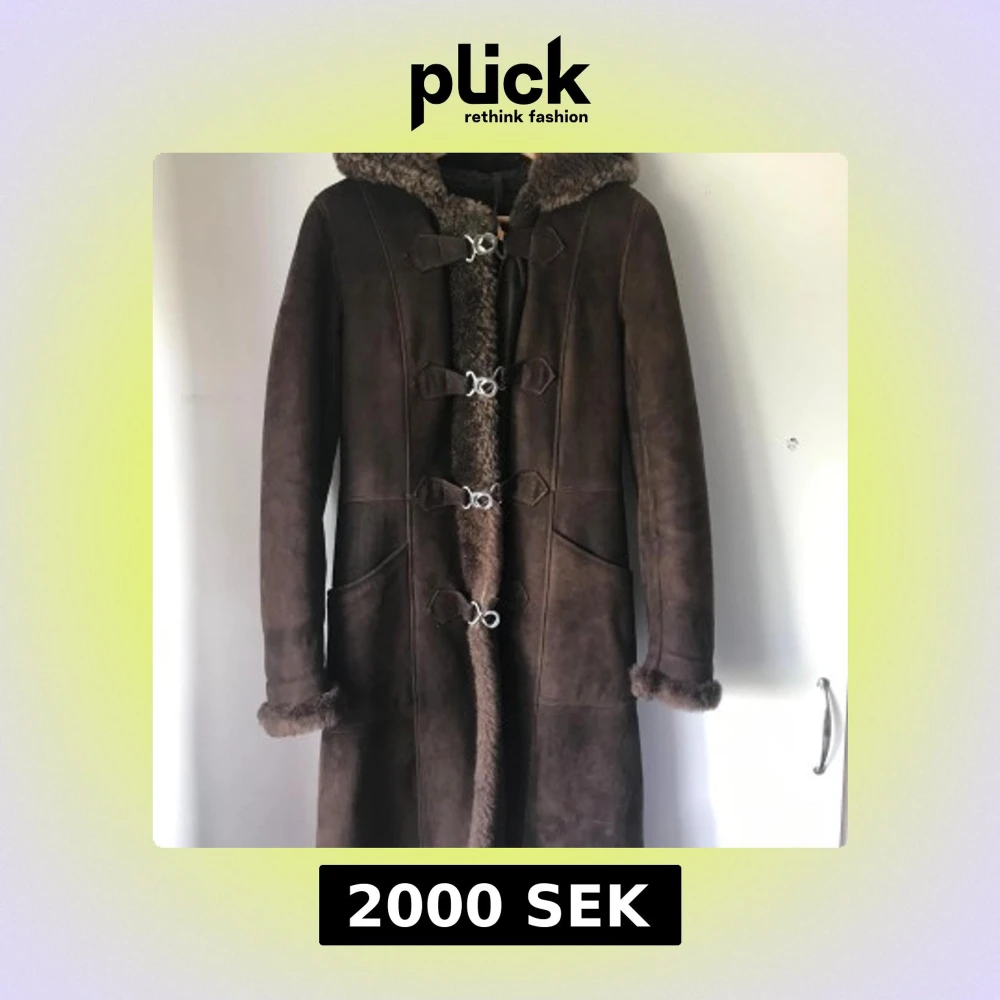 Snygg lång brun pälsjacka med huva och pälsdetaljer vid ärmslut och insida. Jackan har dekorativa spännen framtill, stora fickor och bälte i ryggen. Perfekt för kalla dagar när du vill hålla stilen och värmen.