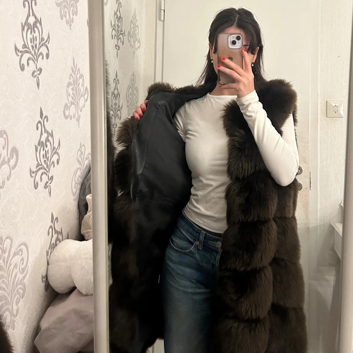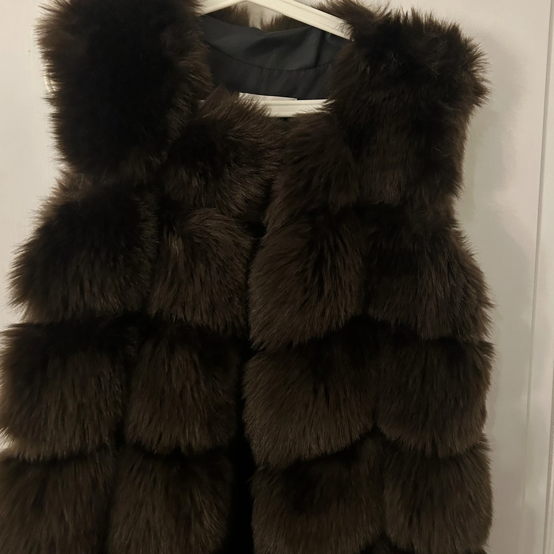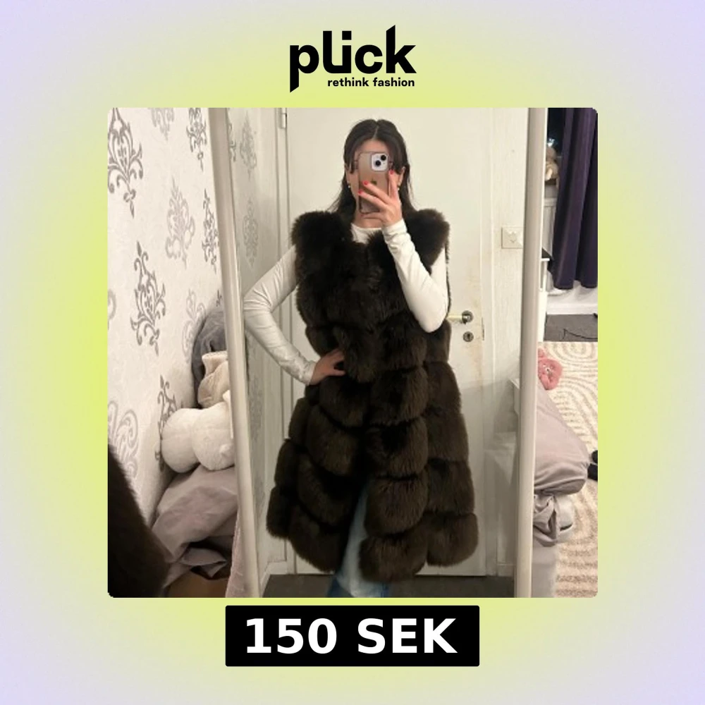 Snygg och elegant brun lång pälsväst perfekt för kyliga dagar. Västen har en lyxig look med sitt fluffiga material och är utan ärmar, vilket gör den lätt att bära över en tröja eller blus.
