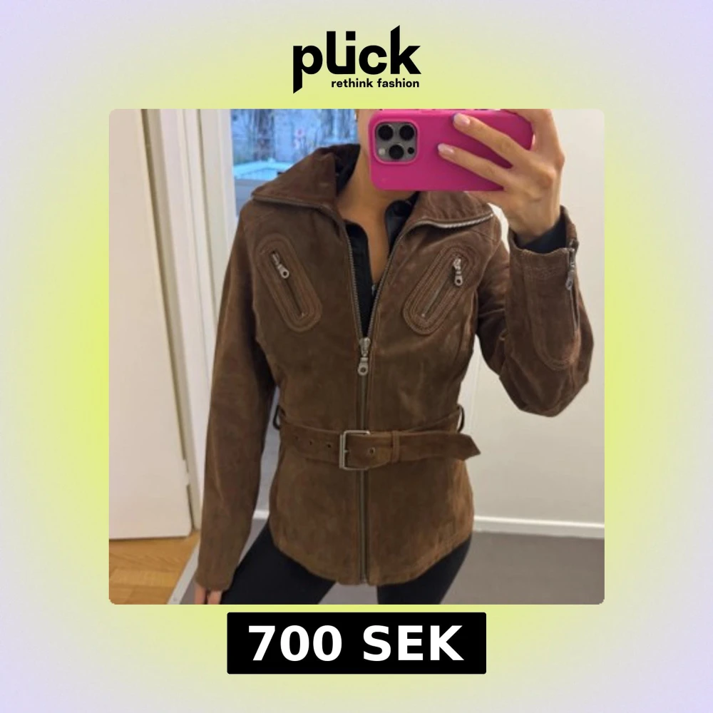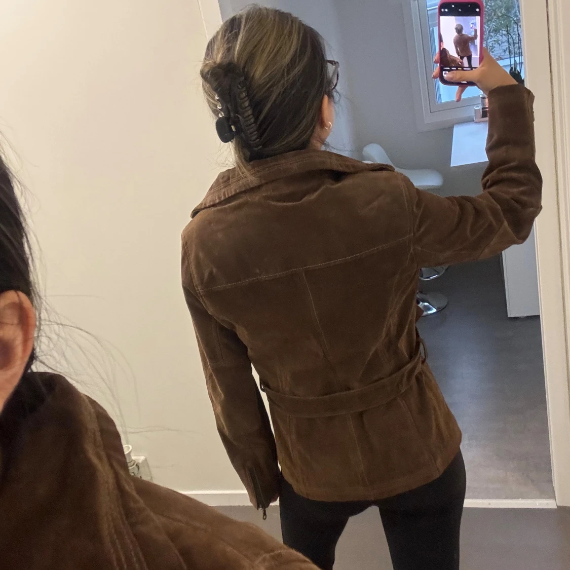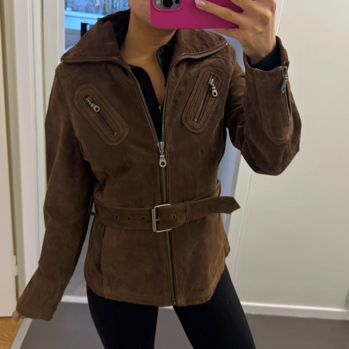 Snygg brun jacka i mocka imitation med markerad midja tack vare bälte. Jackan har två dragkedjefickor på bröstet, dragkedja framtill och på ärmsluten. Stora slag och en cool, lite retro känsla. Perfekt för dig som vill sticka ut med en unik jacka. Perfekt skick
