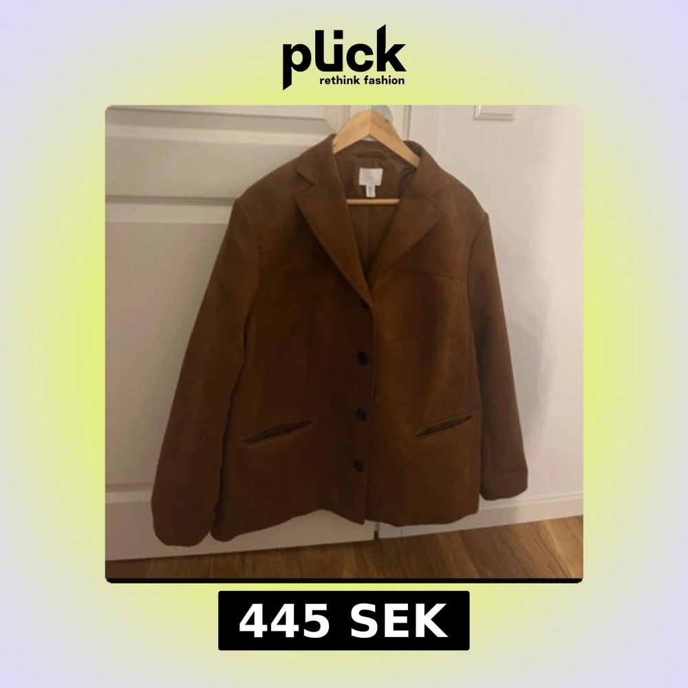 Säljer en brun kavaj från H&M i storlek L. Jackan har klassisk krage, fyra knappar framtill och två sneda fickor. Materialet är mockaliknande och ger en snygg och stilren look. Perfekt nu till hösten🍂🍁