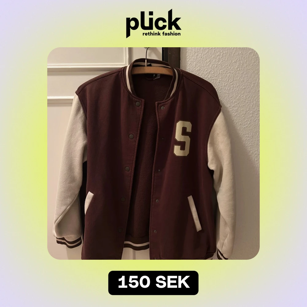 Snygg brun och vit jacka från H&M med bokstaven 'S' på framsidan och texten 'Seattle' på baksidan. Jackan har långa ärmar och stängs med knappar. Perfekt för en avslappnad stil.