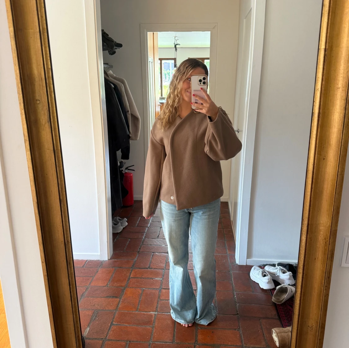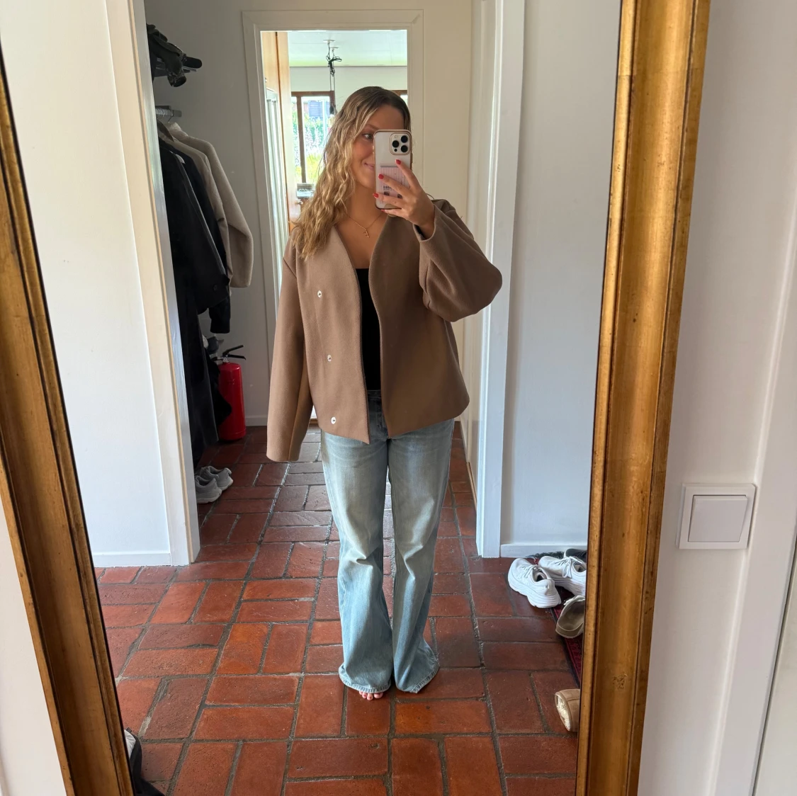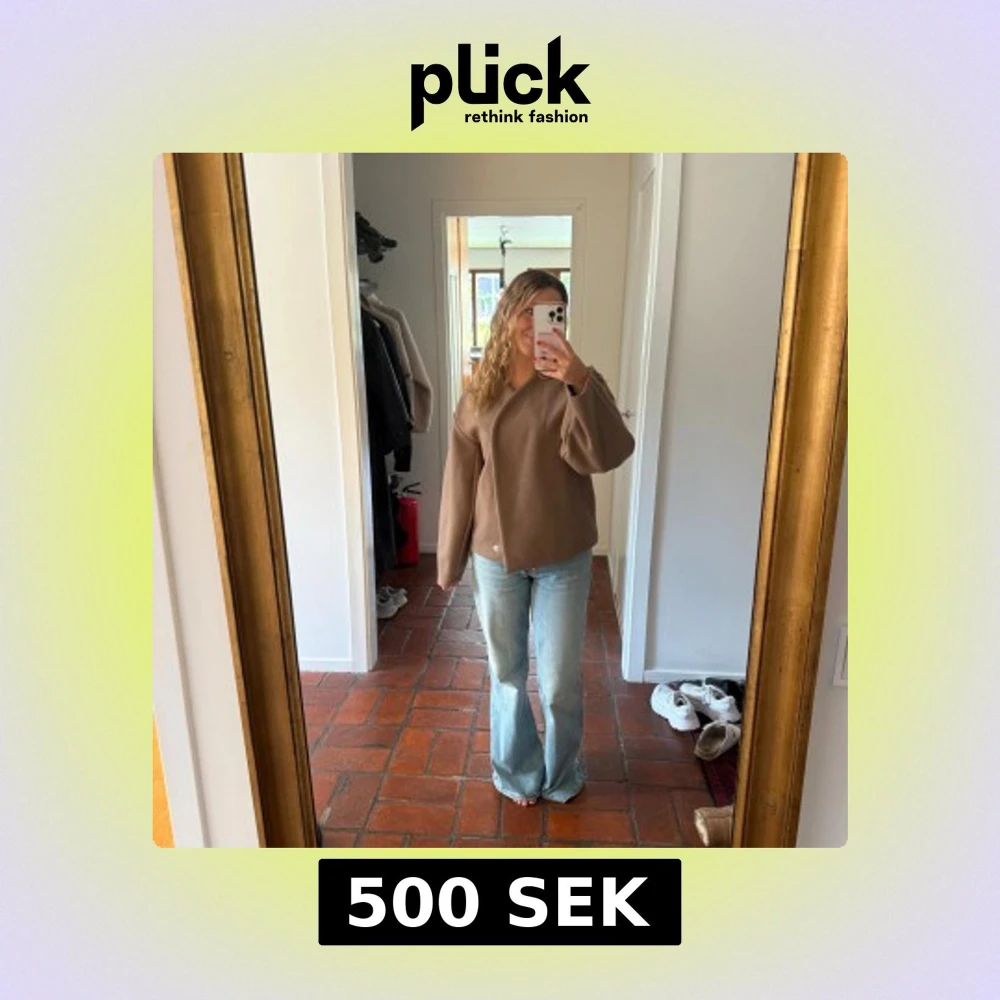 Säljer en snygg brun kappa i omlottmodell med stora knappar framtill. Jackan har en rak och loose passform med långa ärmar och är tillverkad i ett mjukt material som känns lite ulligt. Perfekt för dig som gillar stilrena och minimalistiska plagg.