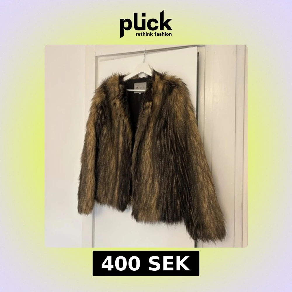 Säljer en brun och svart pälsjacka från Ava June i storlek 36. Materialet är akryl och polyester. Finns två ”hakar” så man kan stänga jackan nertill.