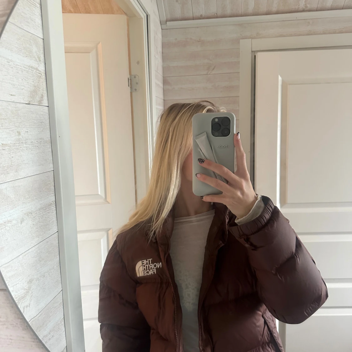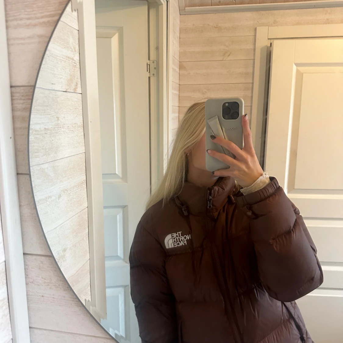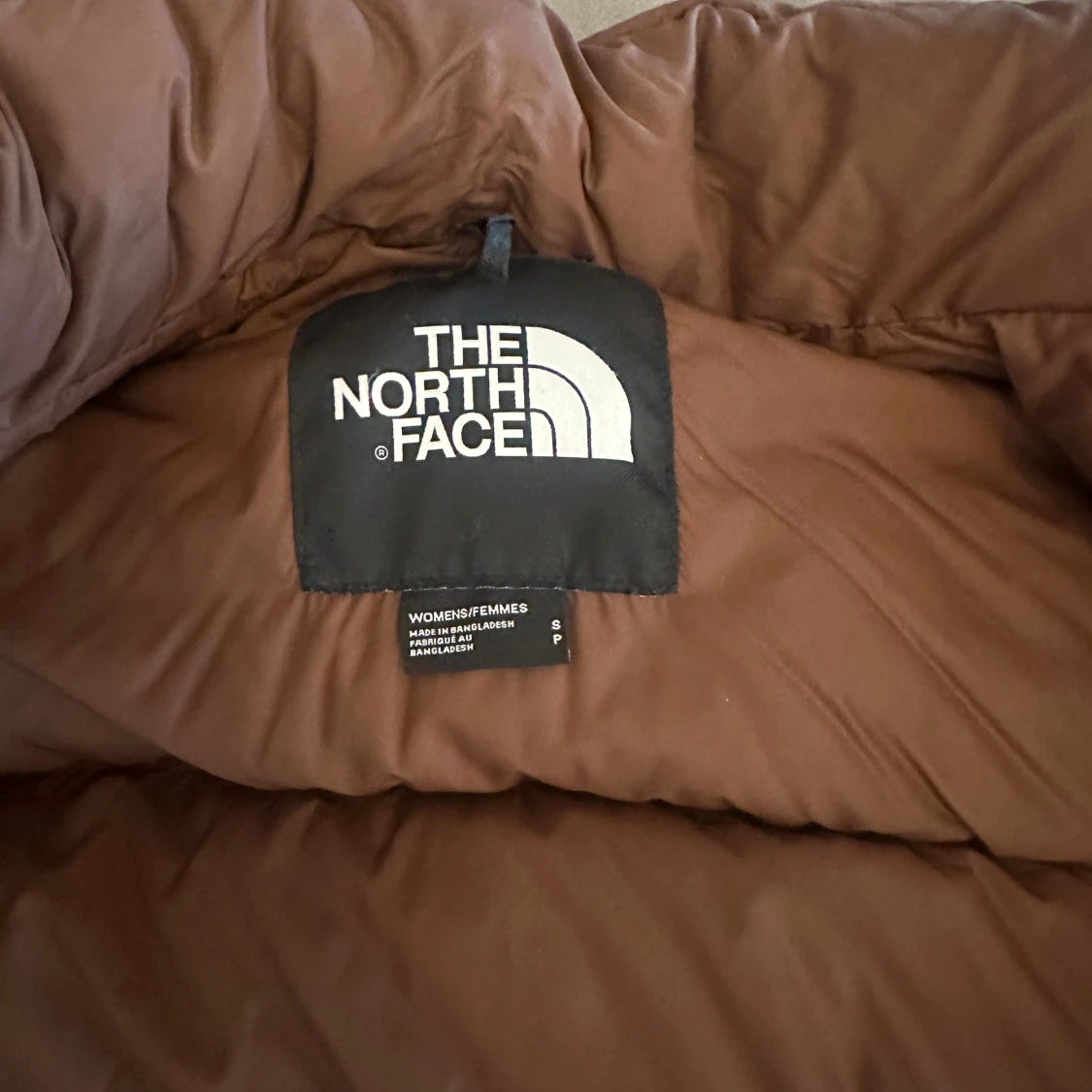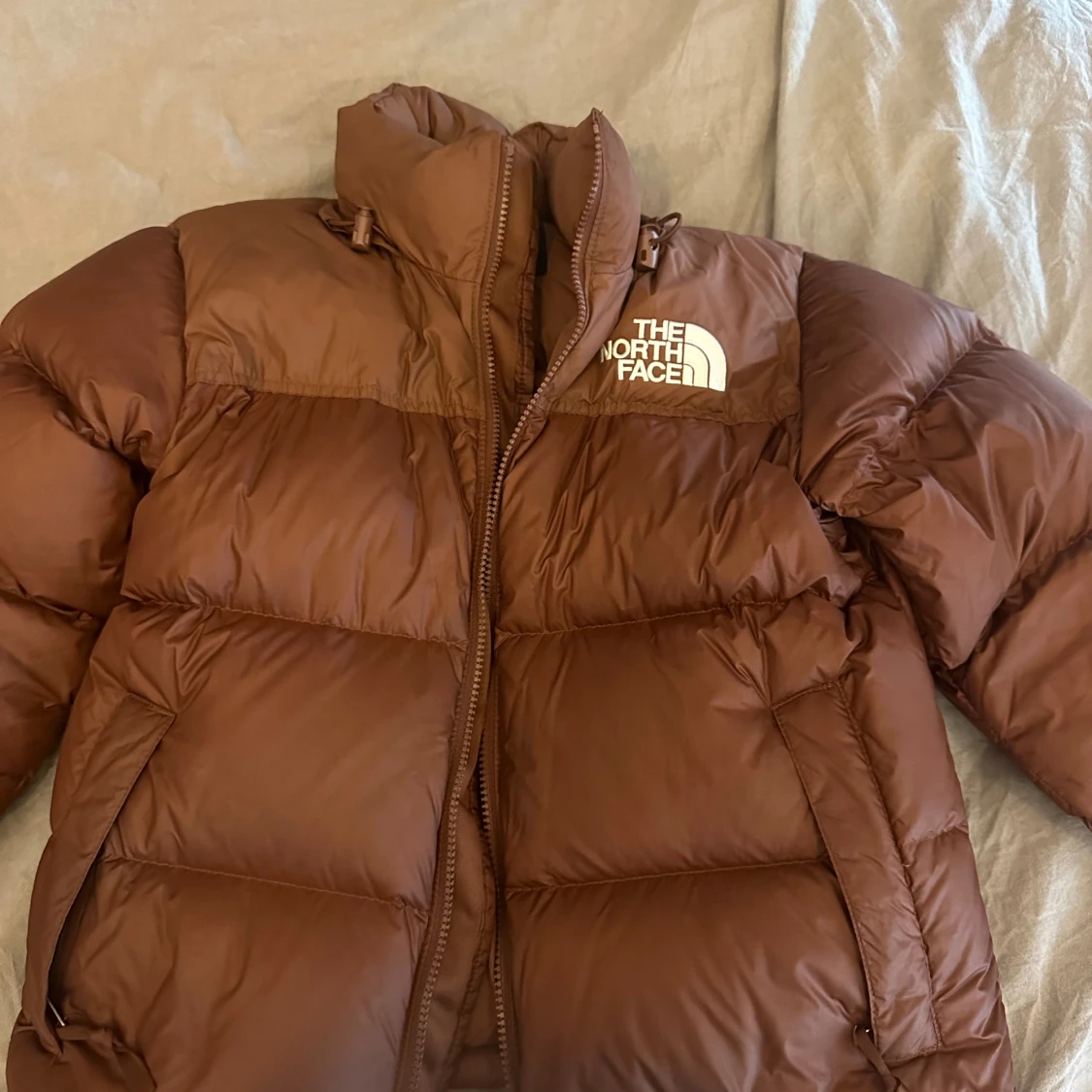 Säljer en brun pufferjacka från The North Face i storlek S. Jackan har hög krage, dragkedja framtill och klassisk logga på bröstet. Den är vadderad och har en loose passform, perfekt för kalla dagar. Materialet är syntet och dun, vilket gör den riktigt varm och skön. Jackan har små defekter som även visas på en av bilderna!