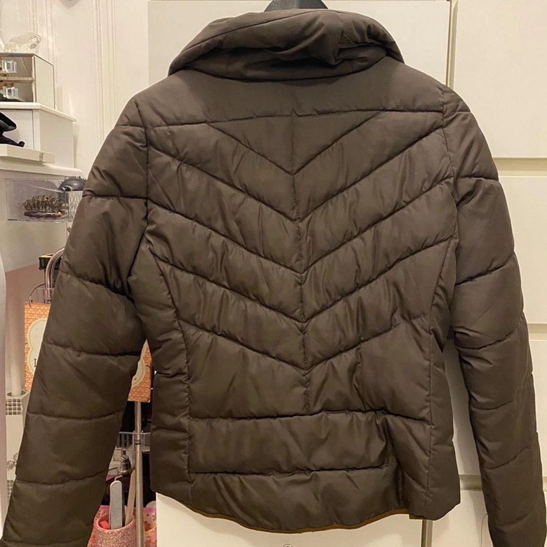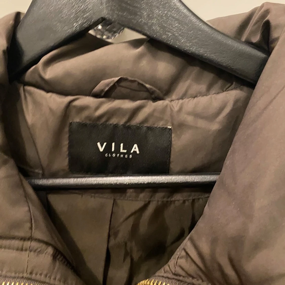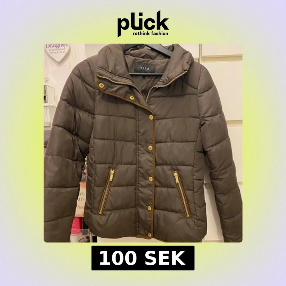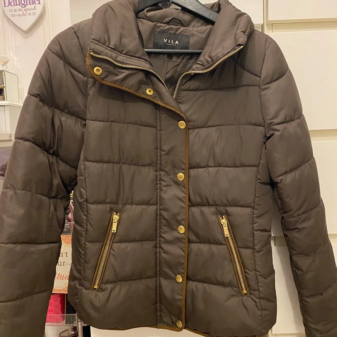 Snygg brun pufferjacka från Vila med guldiga dragkedjor och knappar. Jackan har quiltad design, hög krage och två fickor framtill med dragkedja. Perfekt för kyliga dagar och ger en cool vibe till din outfit.