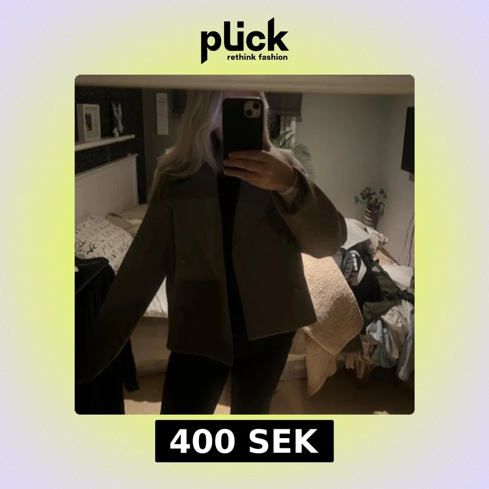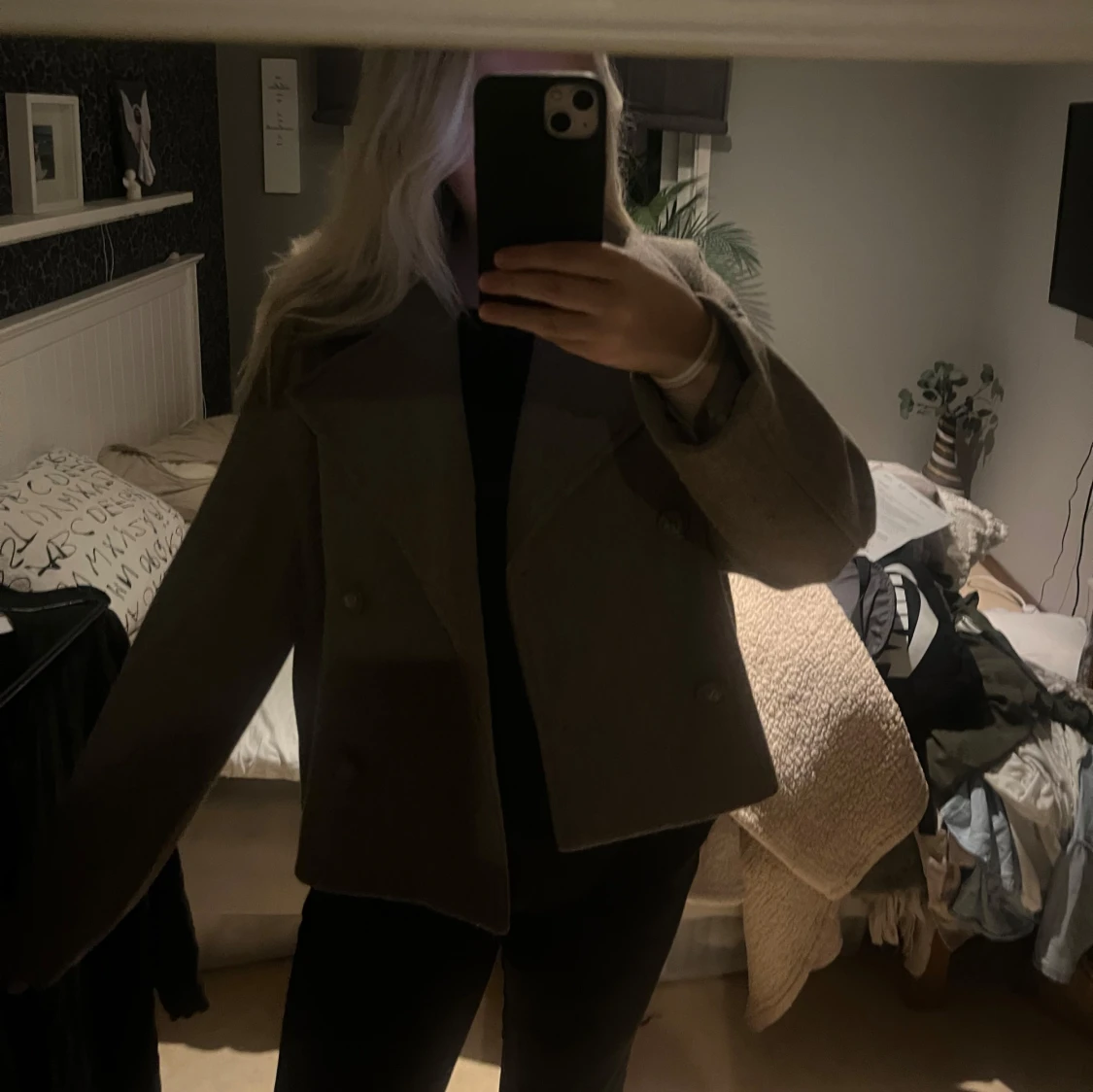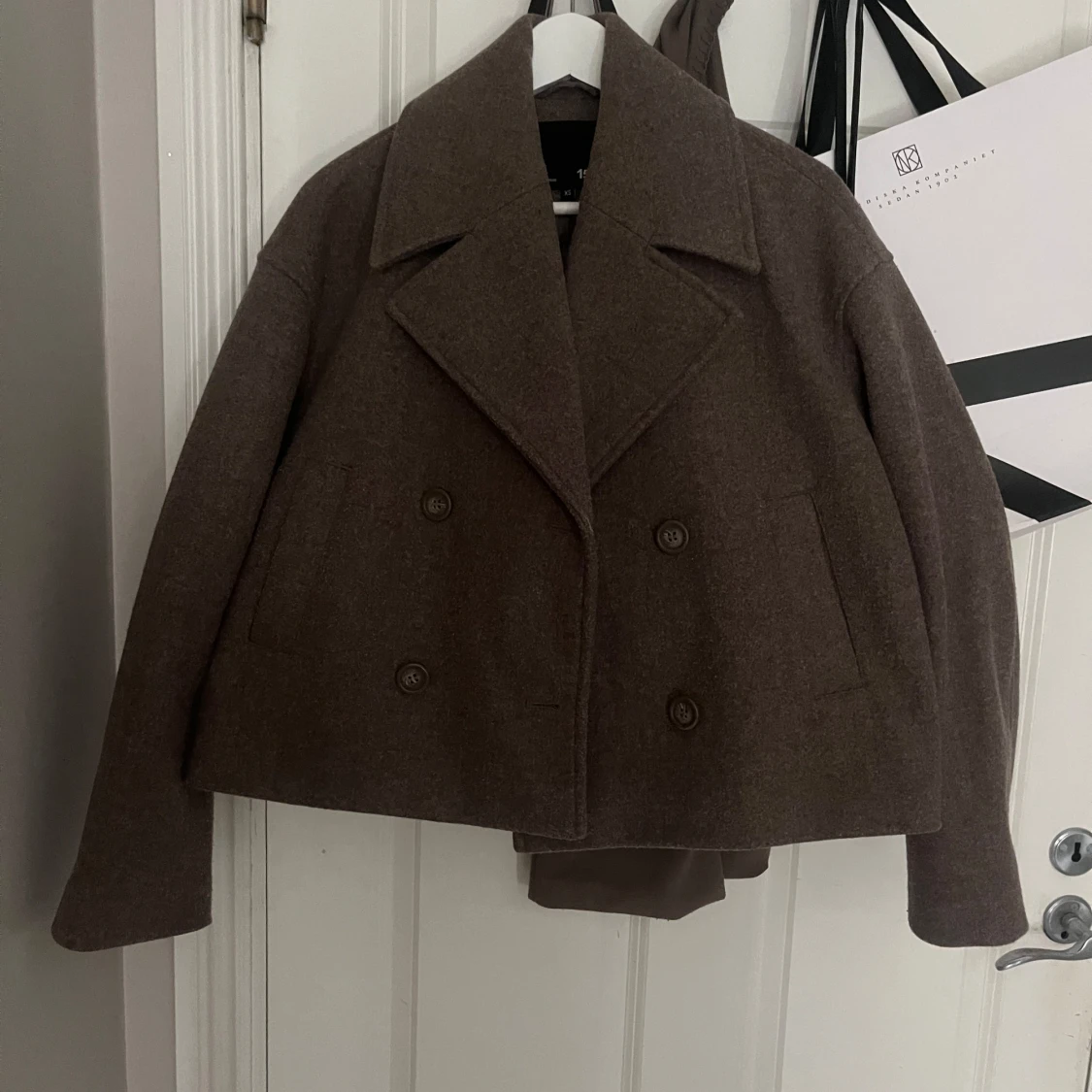 Snygg brun skepparkavaj med bred krage och dubbelknäppning. Jackan är croppad och har raka ärmar samt två fickor framtill. Perfekt för dig som gillar klassisk stil med en modern twist.
