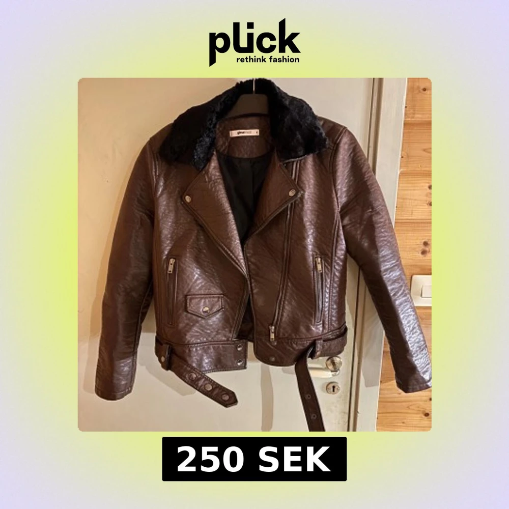 Snygg brun skinnjacka från Gina Tricot med svart fuskpäls på kragen. Jackan har klassisk bikerstil med dragkedjor, knappar och bälte i midjan.