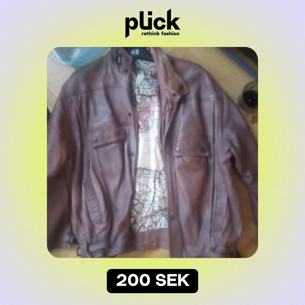 Säljer en snygg brun skinnjacka från H&M. Jackan har en cool vintage-look med en unik kartmönstrad insida. Den har långa ärmar och praktiska fickor med knappar framtill. Perfekt för höst och vår!